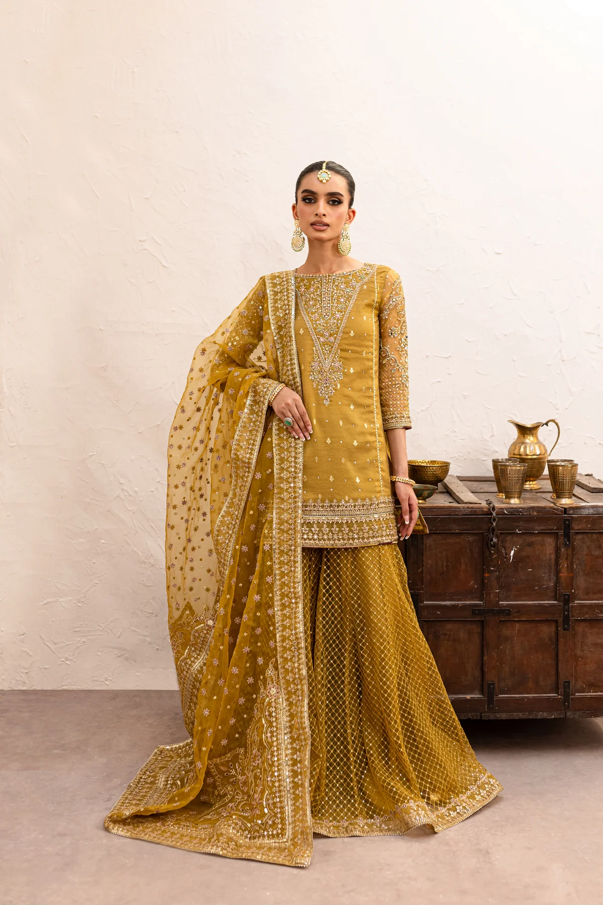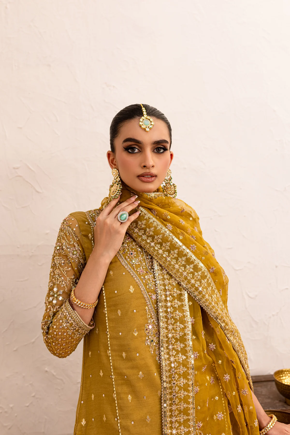 Artfully designed shirt presents a delightful display of zari lawn in the shades of olive. Striking details withhold an embroidered neckline with a touch of adda work and fancy collage – enhanced with motif spread on shirt front. To elevate the creation, direct adda border is added at shirt hem finished with samosa lace. Heavily embroidered three quarter sleeves feature mirror work, finished with samosa lace at hem