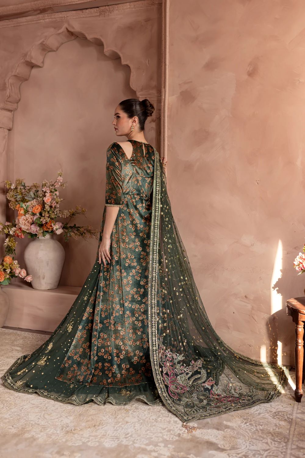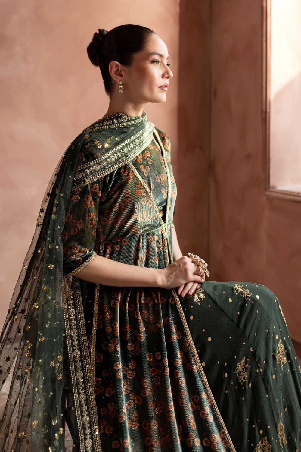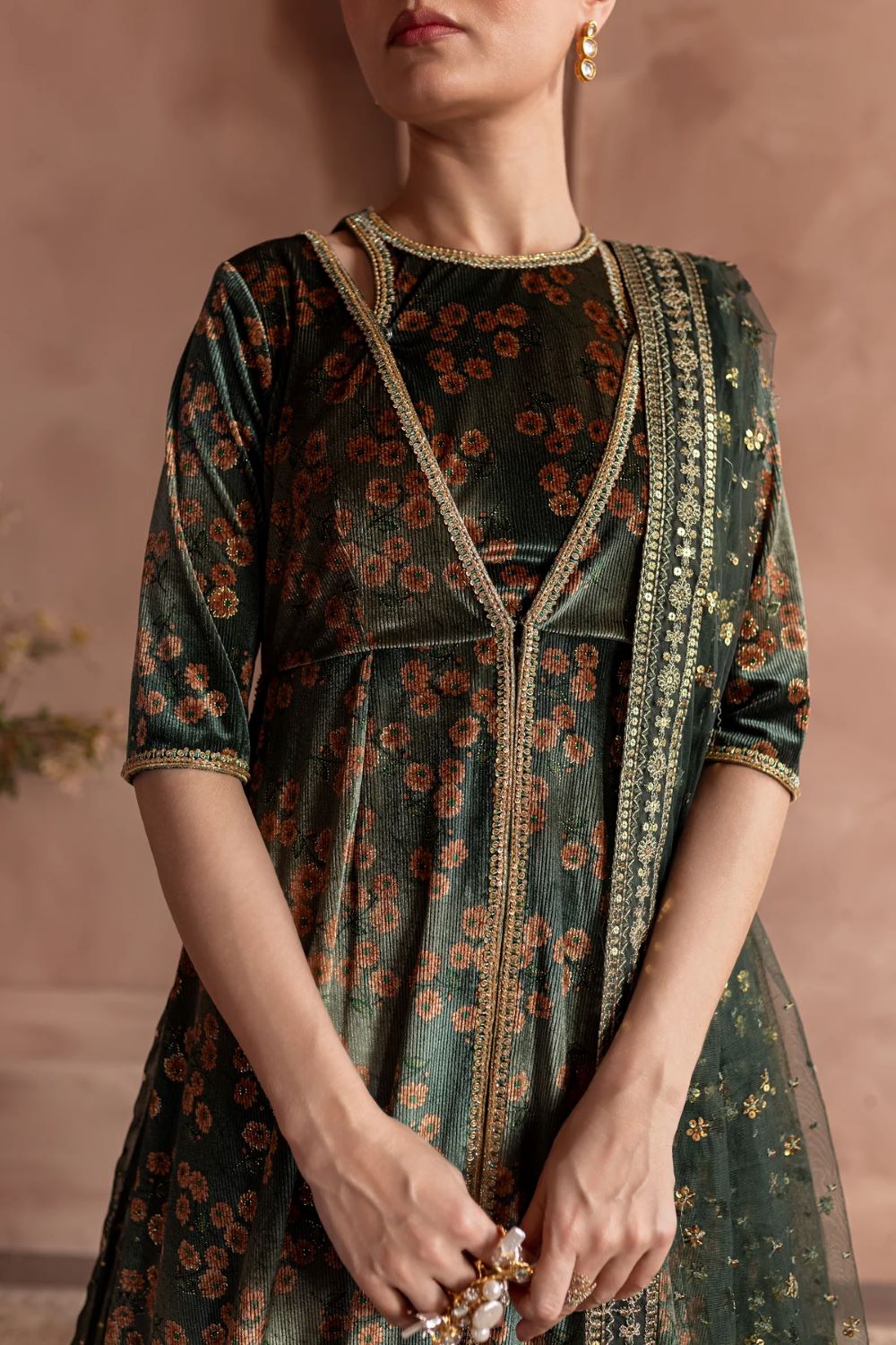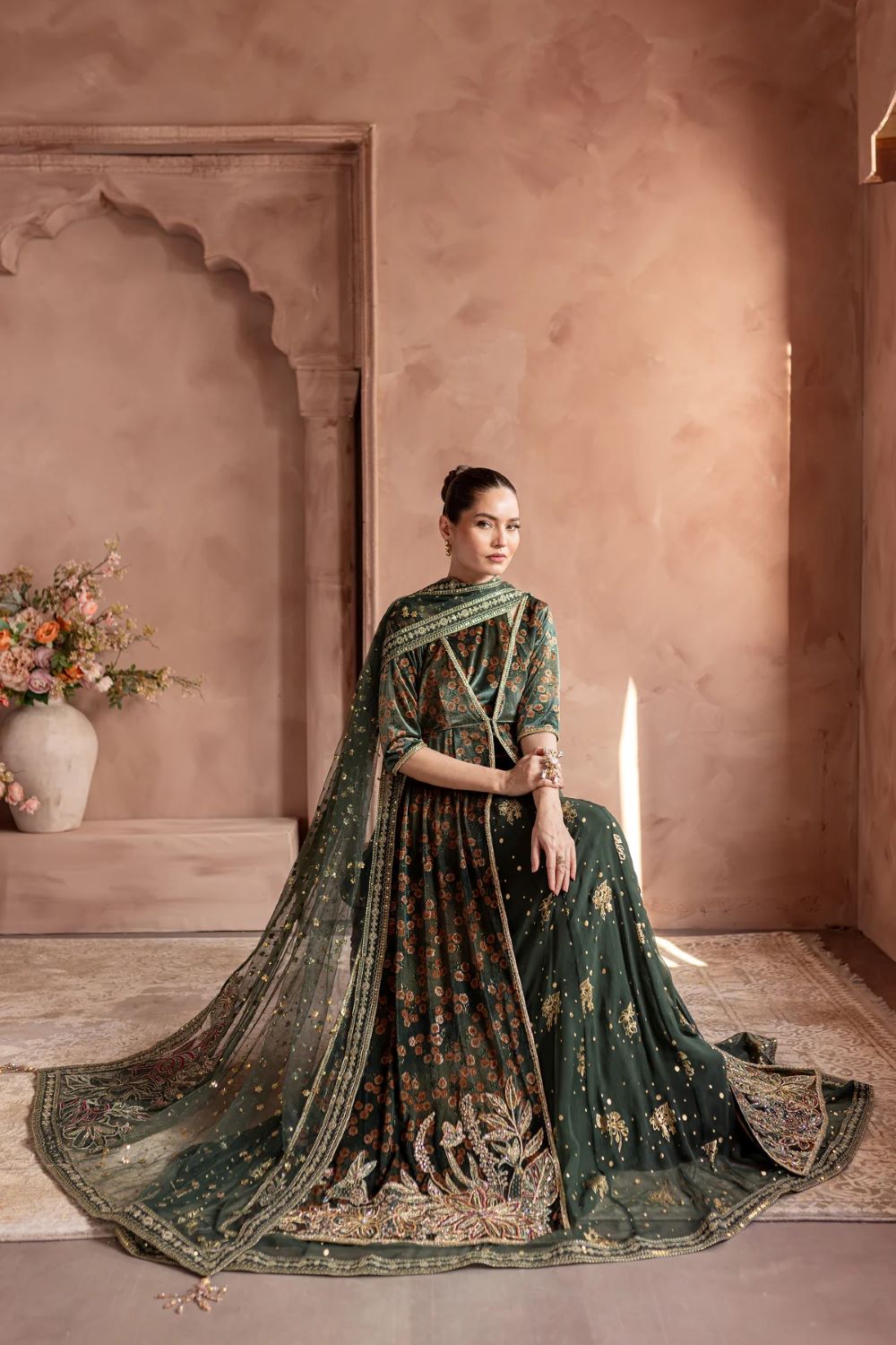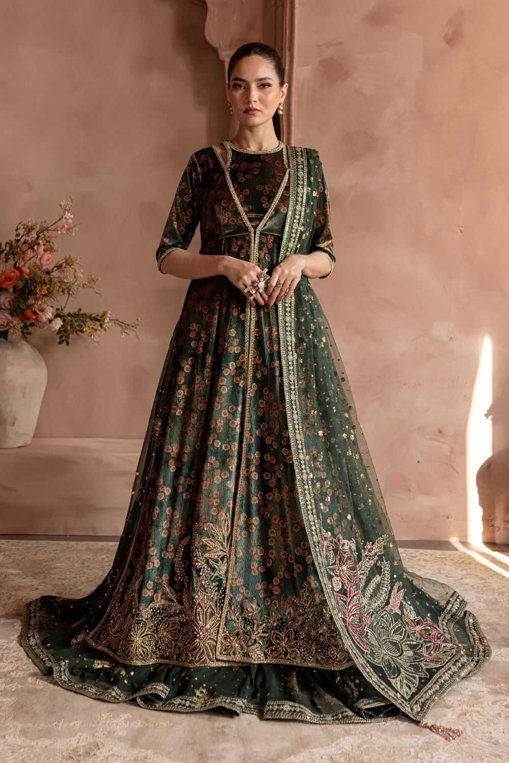 The elegant ensemble features printed a velvet gown with foil shimmer and textured detailing. The hem is adorned with beautifully composed embroidery, enhanced with intricate handwork of crystals, aari, and cutdana moti. Noteworthy details include gown’s edges, neckline, and sleeves finished finely with hand embellishments.