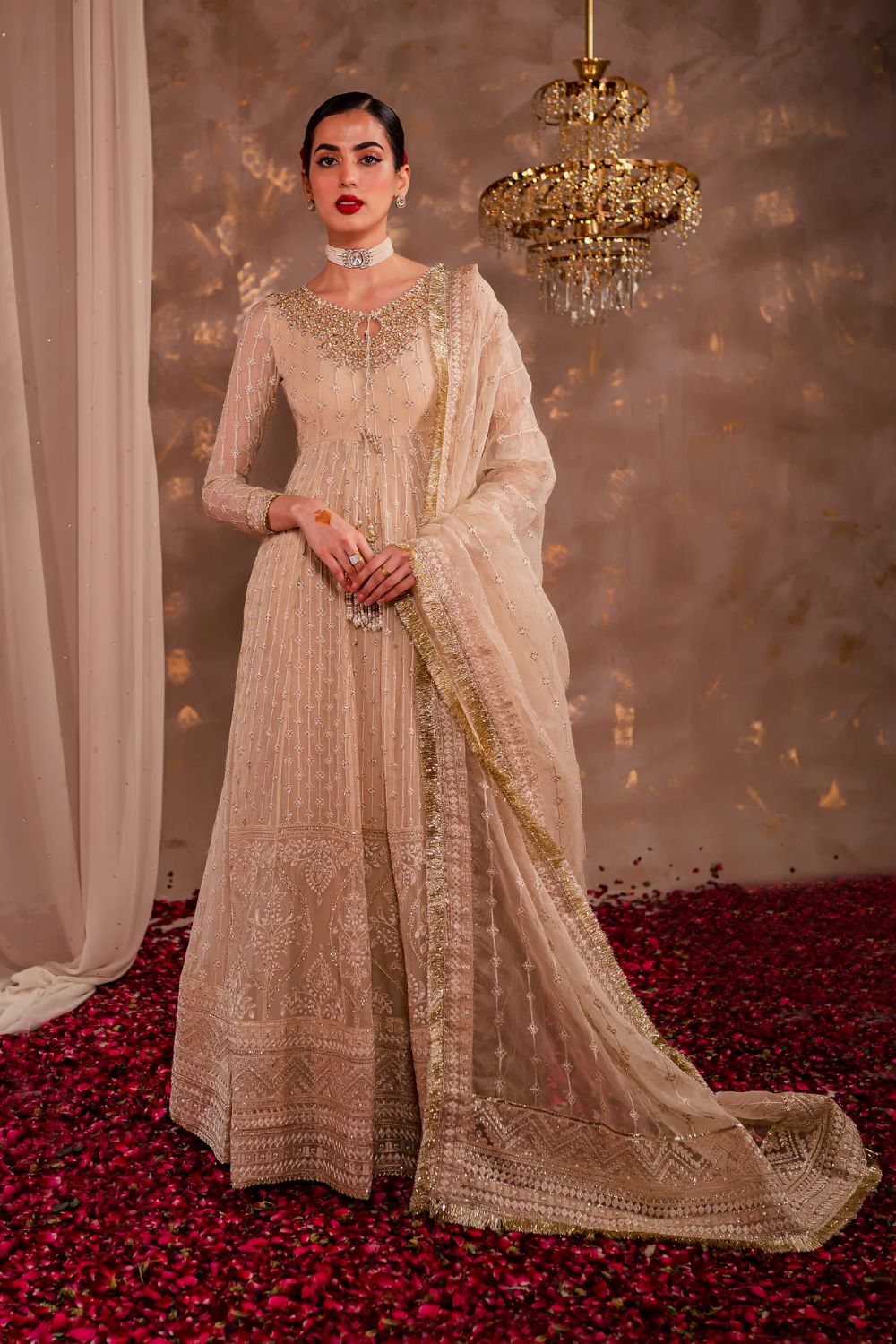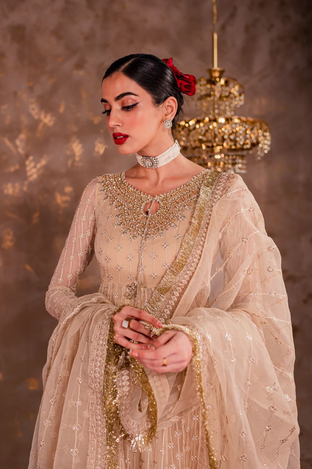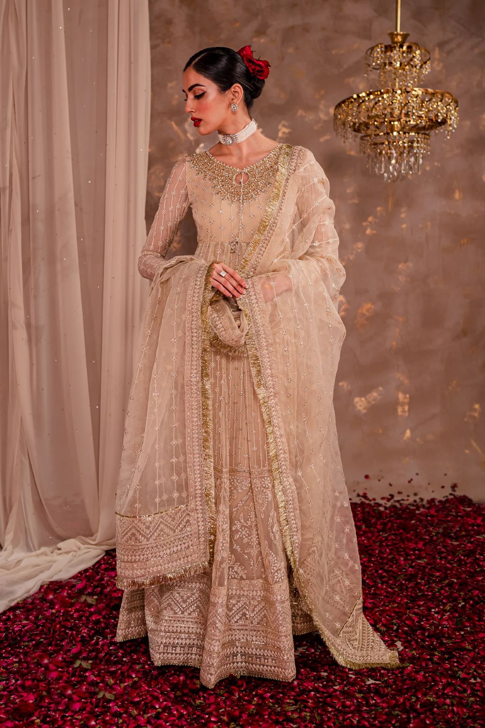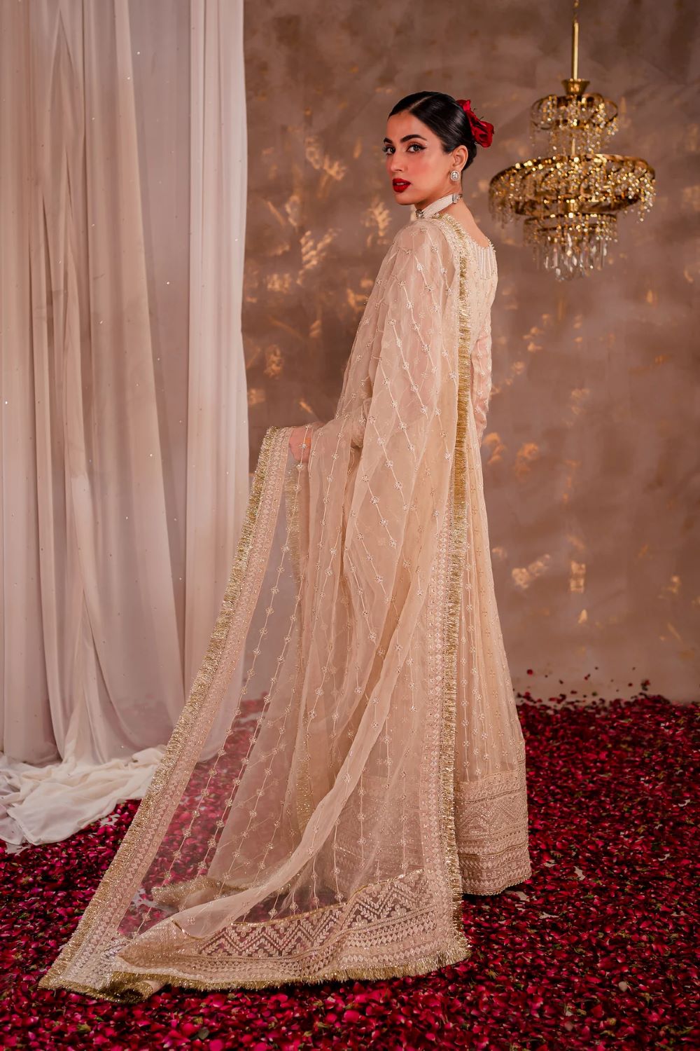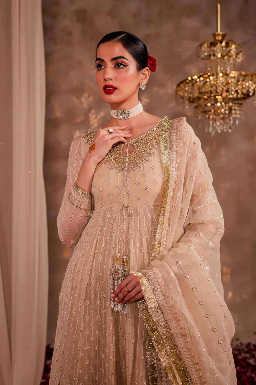 Gracefully cascading long frock cut from the finest quality crinkle chiffon in the shades of pearl white. Embellishments feature intricately embroidered yoke with details of adda work and fancy tassel hangings with further glitzy details of heavily embroidered panels with hints of sequin spread all over the frock finished with samosa lace