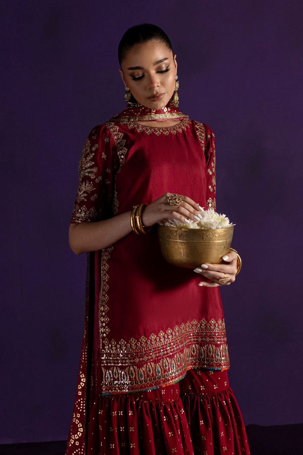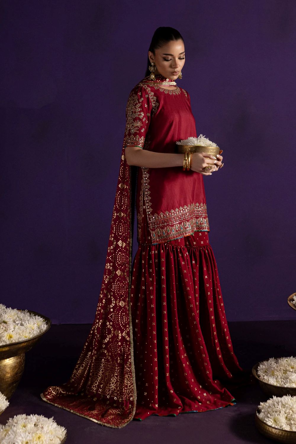 This sophisticated look is paired with a georgette chiffon metallic foil high-got gharara, adding graceful movement to the outfit.