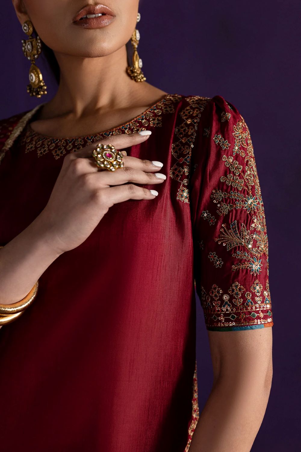 This stunning red raw silk short smart-fit shirt features intricate embroidery along the neckline and hem, complemented by quarter-length embroidered sleeves. Printed facings add a modern touch to this classic piece.