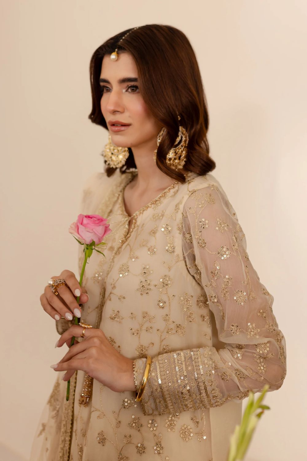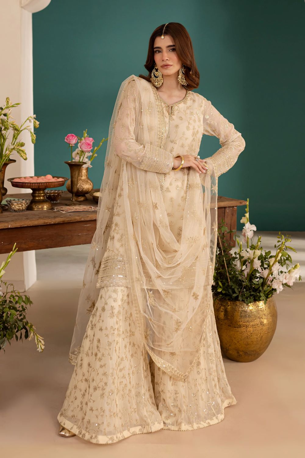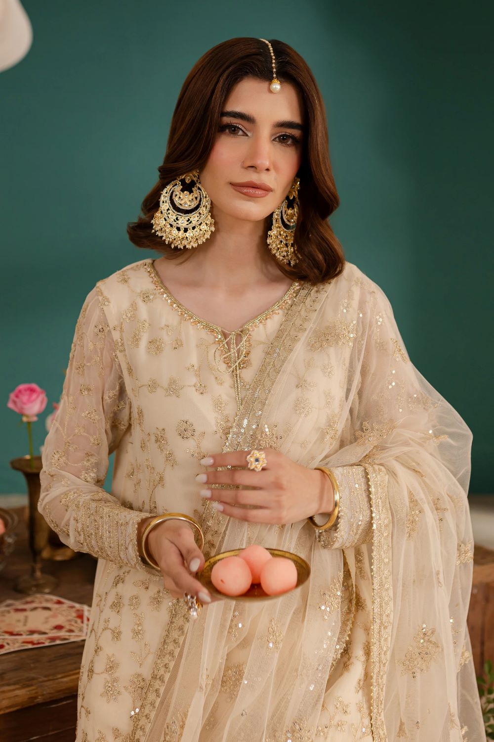 A net embroidered dupatta completes the look, adding a delicate and ethereal finish with its intricate embroidery.