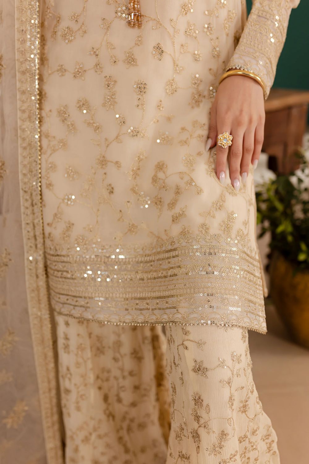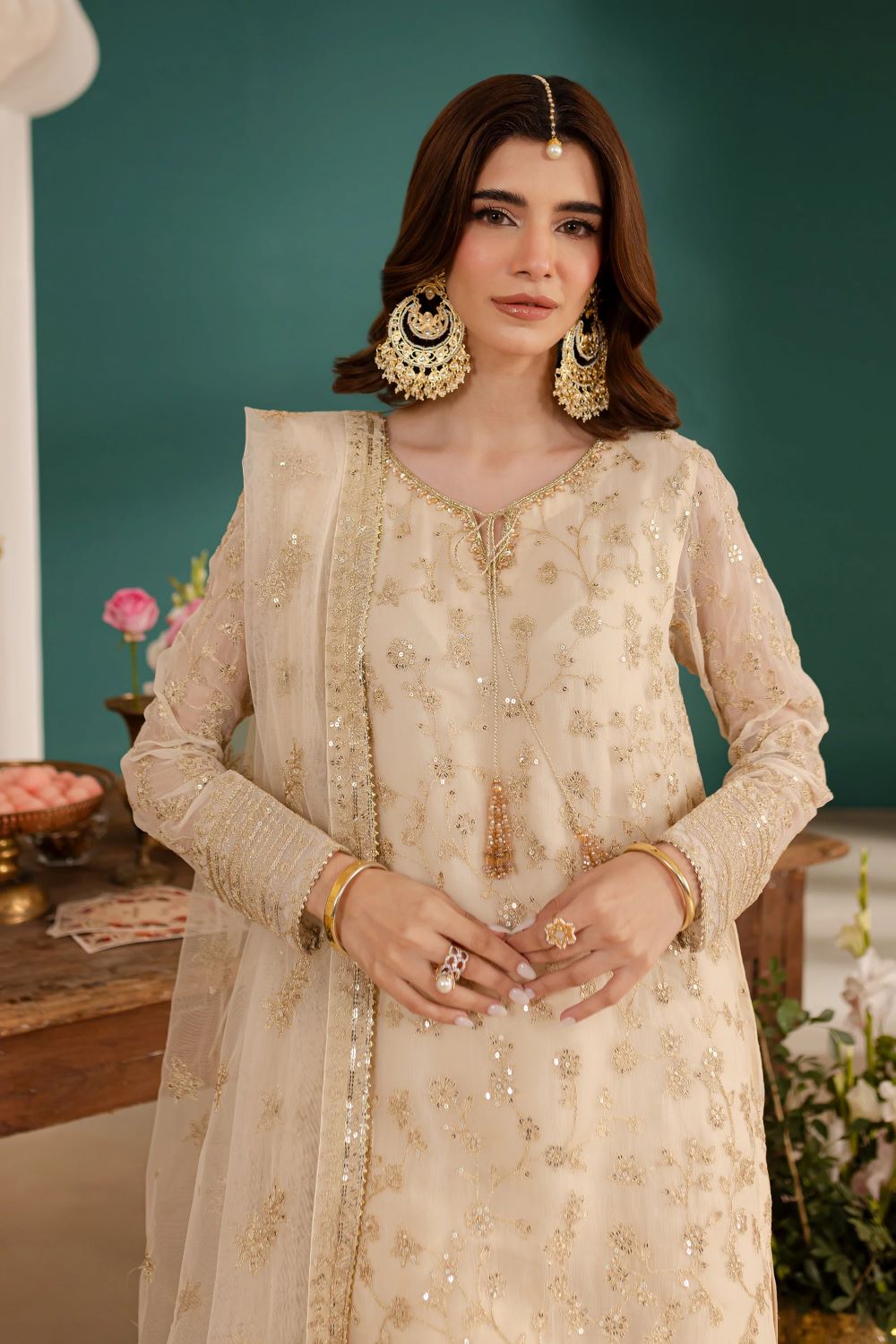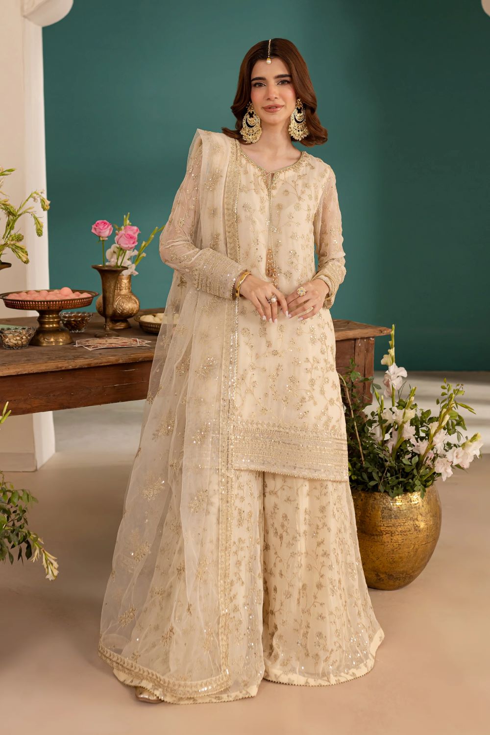 A net embroidered dupatta completes the look, adding a delicate and ethereal finish with its intricate embroidery.