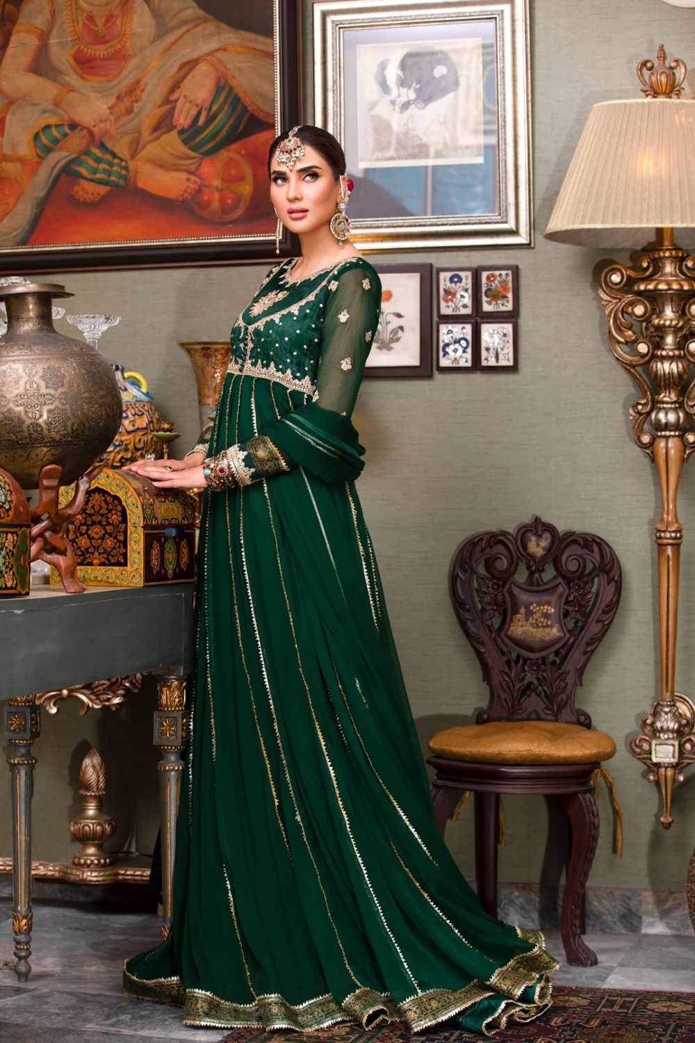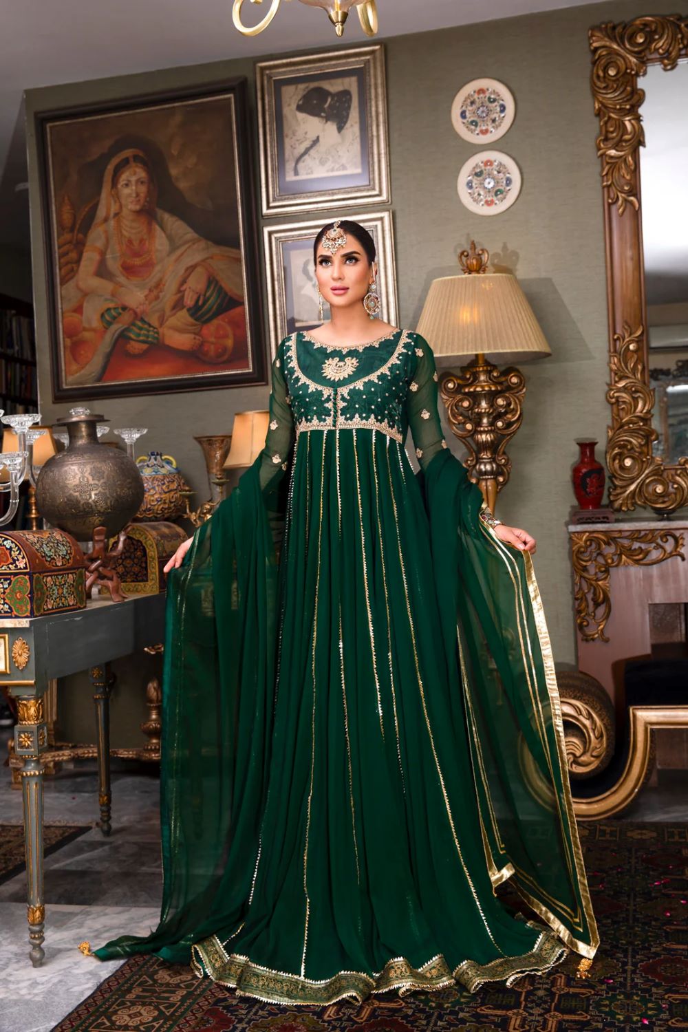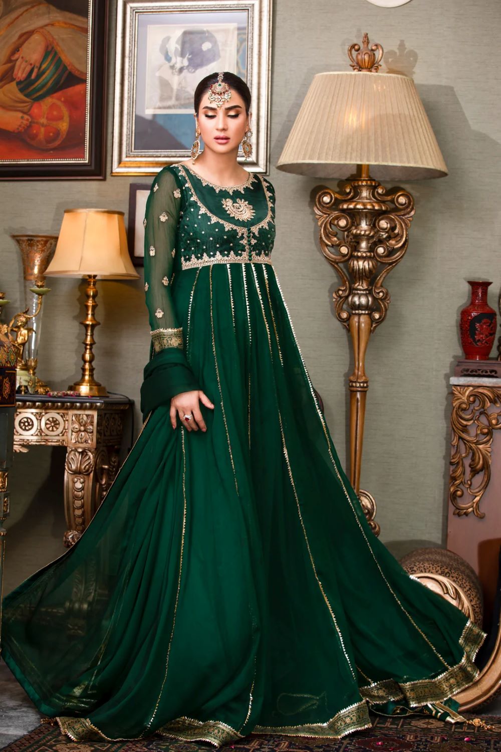 . An Absolute Show Stopper. The ‘Zohra Jabeen’ Kalidaar Pishwas Is Designed To Give A Slender Waistline An Extra Flairing Kalis For That Unforgetable Twist And Stunning Silhoutte.