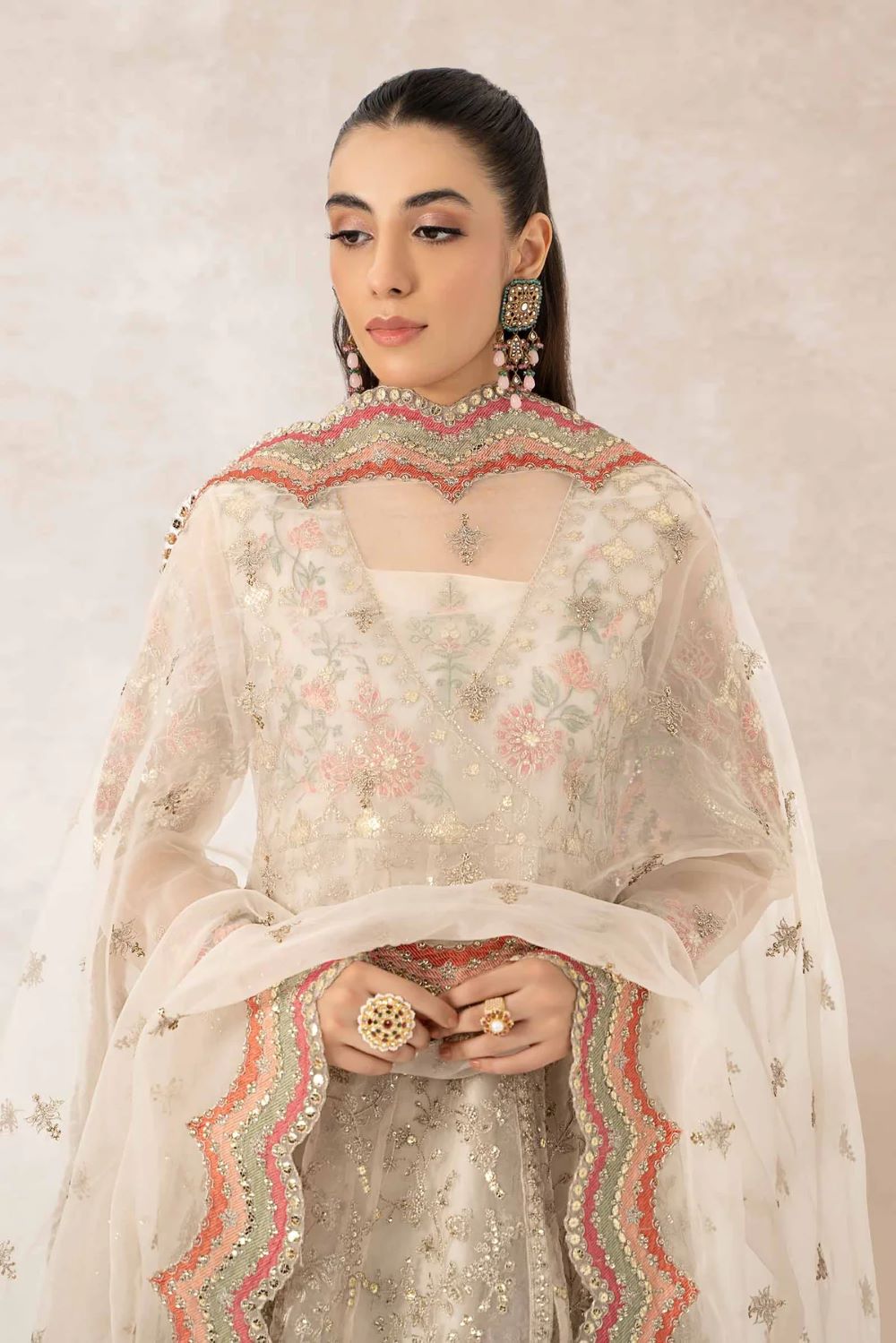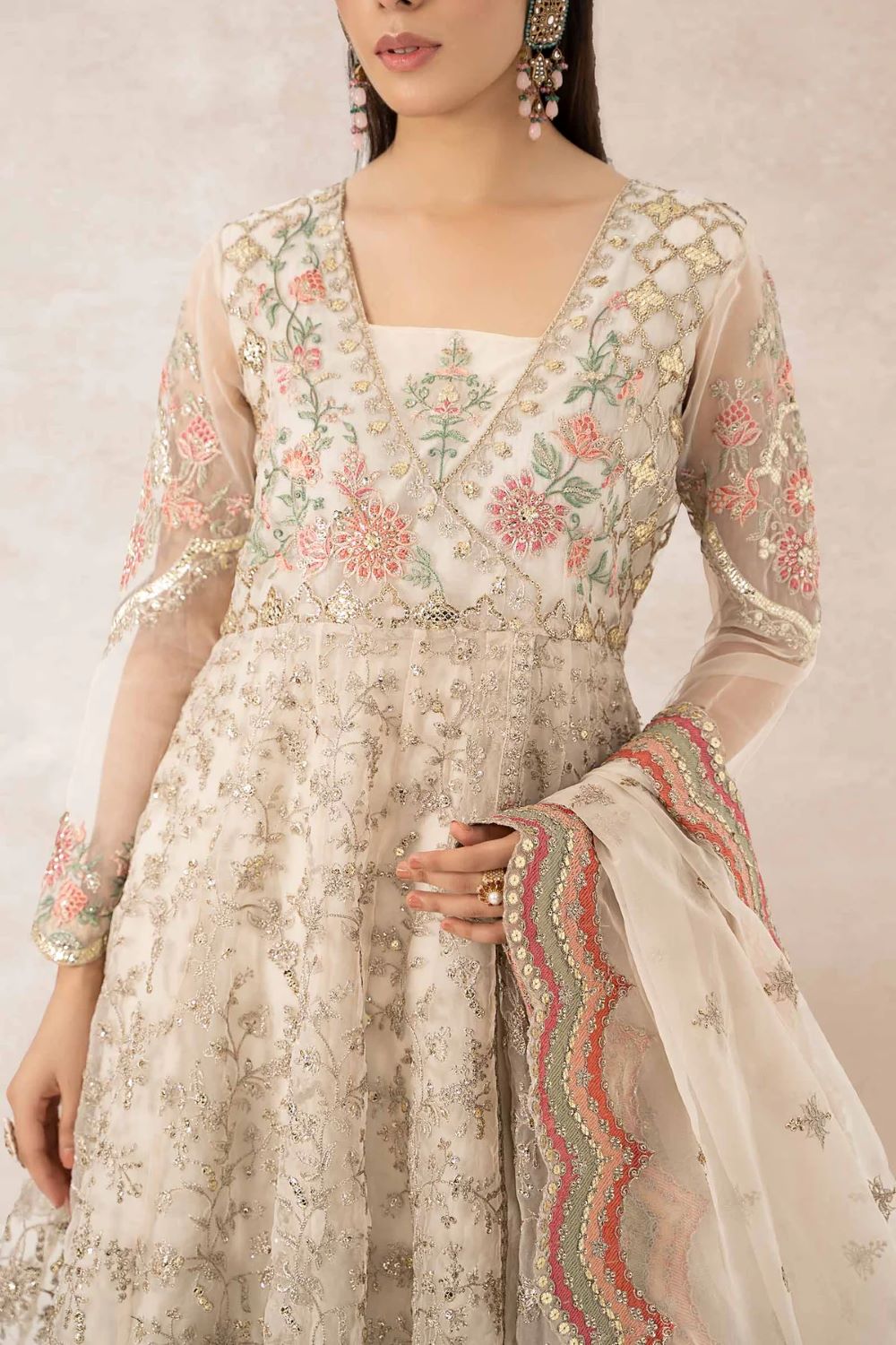 For an everlasting festive look style our off-white, flared angrakha frock intricately handwoven with sequins, tilla & panni embroidery.