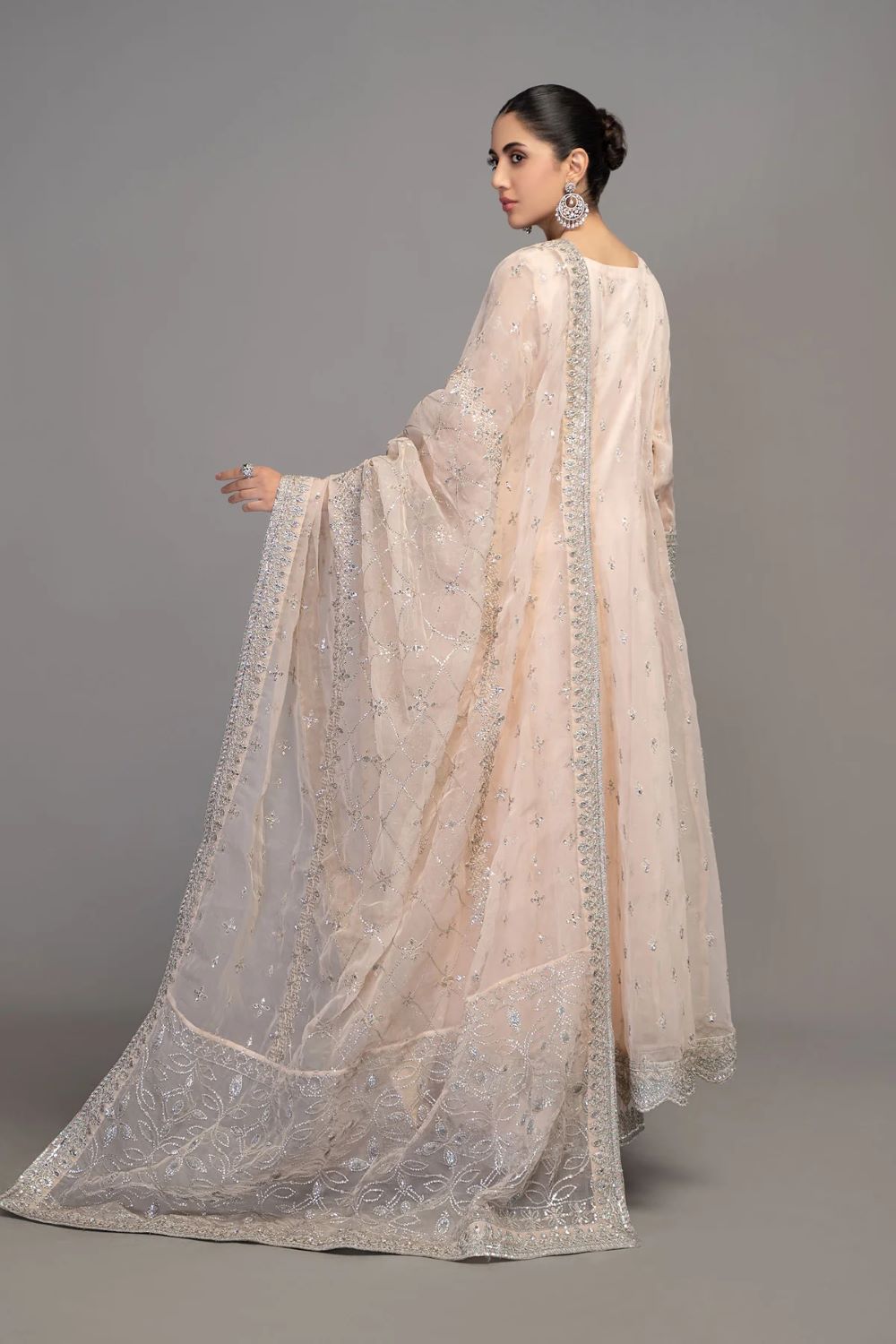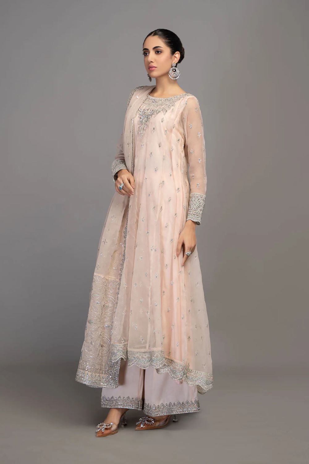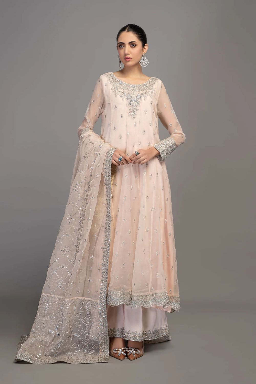 Long paneled frock with embroidered neckline and sleeves along with matching sharara with embroidery at bottom and sequence embroidered organza dupatta.