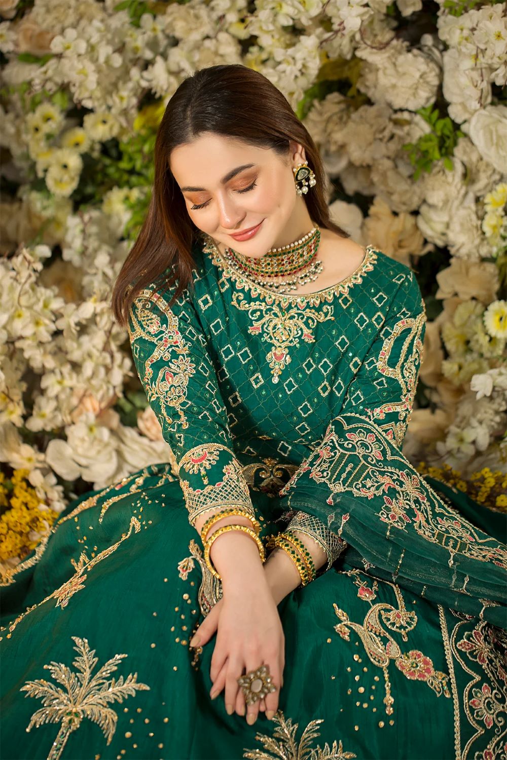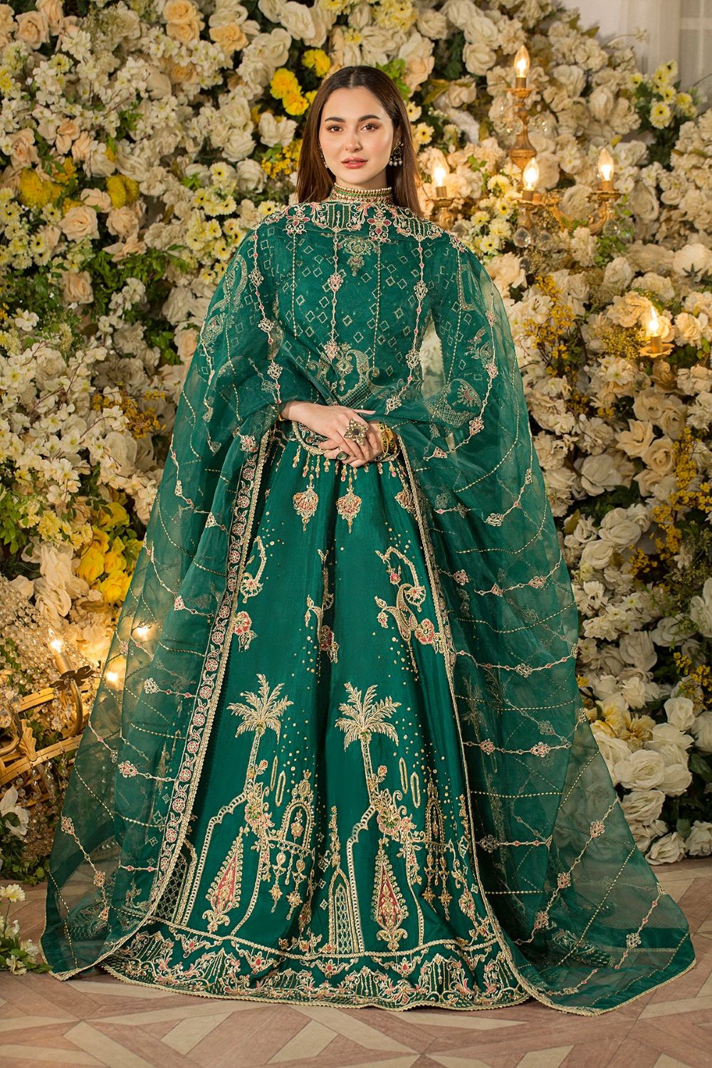 Details:Â This lavishly embellished bottle green lehanga choli is heavily jeweled with multi-head embroidery & hand adda work. The choli has minimal laced details on the straight sleeves & hanging tassels on the ends & back to complete the look. The voluminous bordered lehanga comprises of botanical Mughal motifs to give that majestic look. The bordered dupatta is detailed with embroidery & sitari work. The hand adorned clutch adds more to the look.