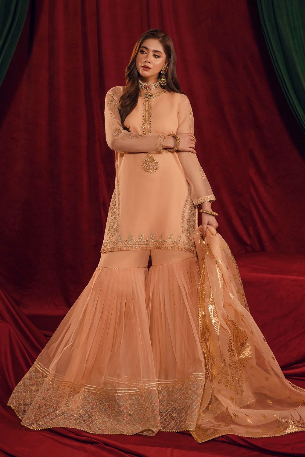 Details:Â Anayaa is a dream come true with its peachy pink hue & delicate machine embroidery with pure adda work jeweling the short shirt with majestic back tassels. Anayaa is paired with voluminous gharara with gota lace & machine embroidered contrasting thick border. Organza dupatta with gold panni motifs & borders enhance the look.