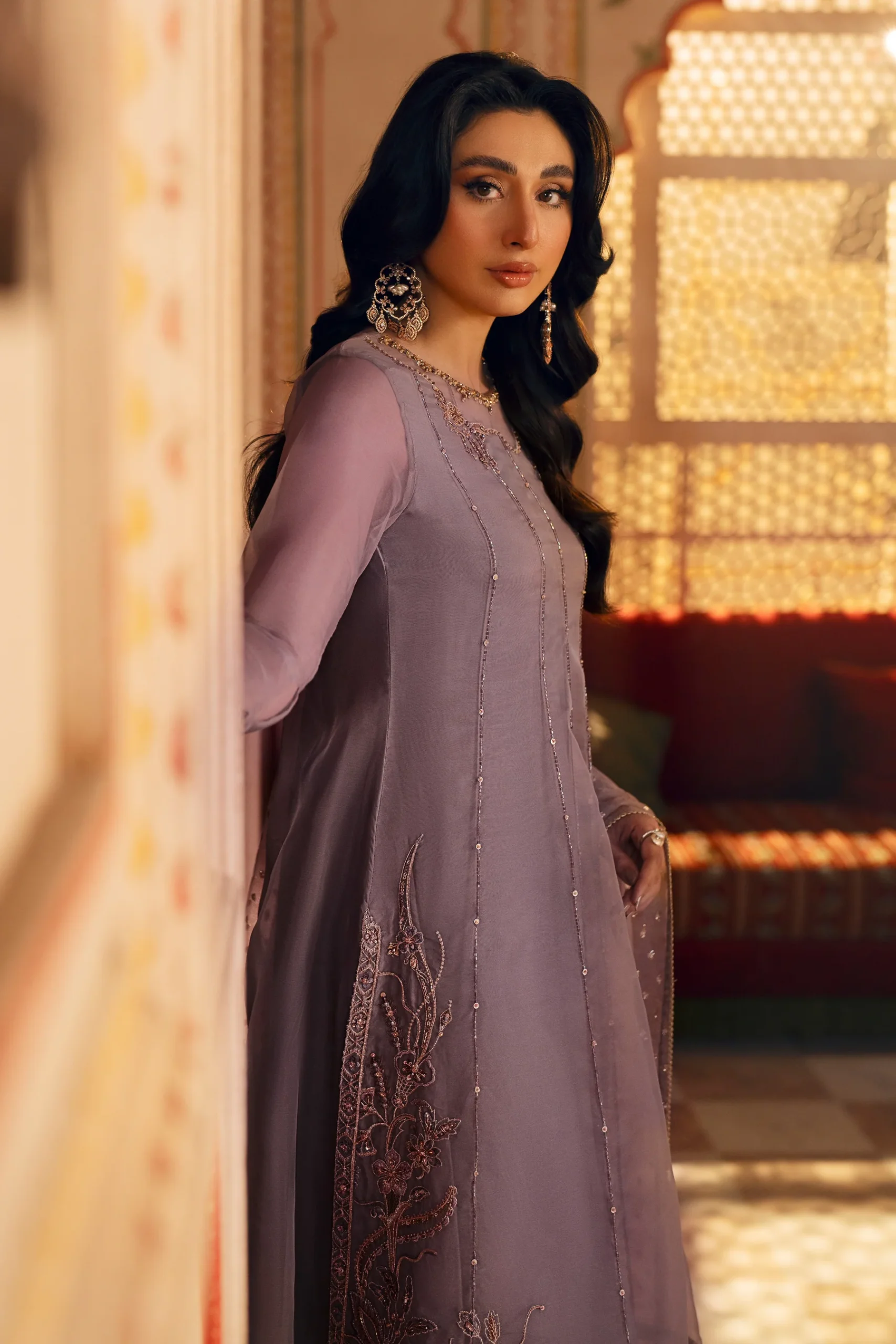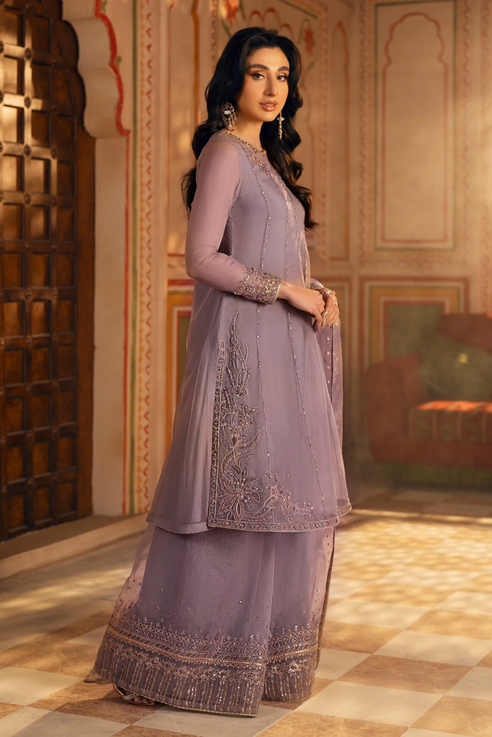 This design features a near-to-neck neckline with back slit, adorned with organza patch, embroidery, sequins and adda work. Fitted round sleeves showcase matching embellishments. The Short Panelled Shirt displays lengthwise adda work lines throughout, with embroidery, sequins and adda work highlighting the slits and border. Asymmetrically placed floral motifs create visual interest on both sides. Paired with a flared PK raw silk trouser featuring embroidered and sequined border. The plain organza dupatta is enhanced with lengthwise Zari organza panels on both sides, finished with embroidery and sequin border detailing.