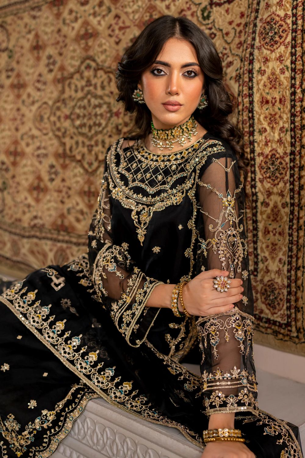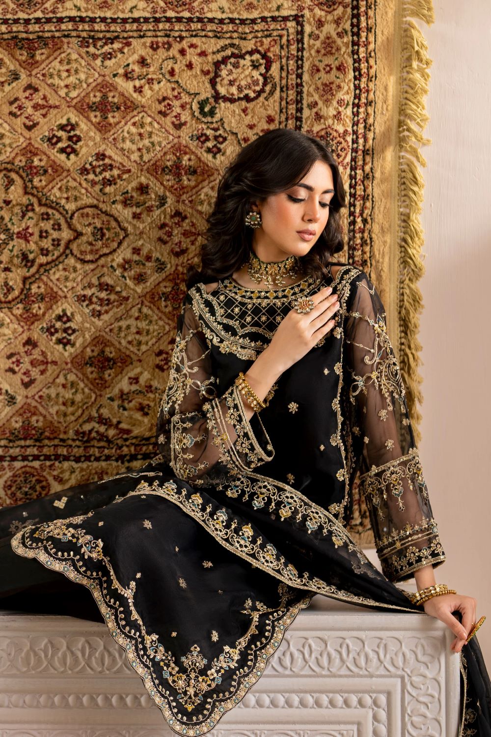 This classic black ensemble has a stylized neckline with side keyholes & stylized embellished motif patterns with embroidery details. The shirt front is delighted with pure adda embellished motif spread. The real showstopper is the contrasting scalloped side seams & border with embellished patterns along with embroidery & sequin work bejeweling both front & back.  The loose fitted sleeves are adorned with contrasting floral embroidery patterns along with sequin work & lace. Leena’s dupatta is adorned with length wise 2-sided embroidery border, mid motif spread & lace finishing. Outfit is paired with plain straight pants.