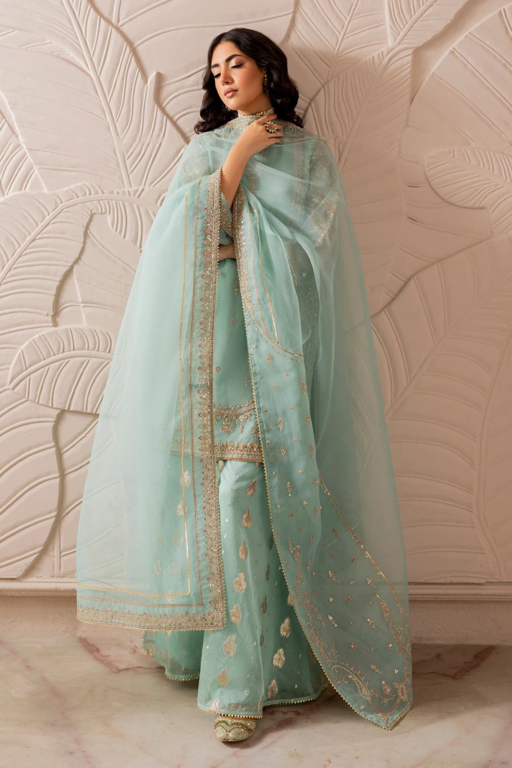 This powder blue ensemble has hand adda embellishments, embroidery & sitari work on the neckline, sleeves & hem. Mid panel is adorned with motif spread. The side panels of the shirt are heavily adorned with tilla, geometrical patterns with base filling technique, embellishments & embroidery along with handmade back tassel.  The broshia organza sharara is finished with lace & goti. Mah Jabeen’s dupatta is bejeweled with composed arch shaped embroidered statement motifs with 4-sided embroidered border finished with goti lace.