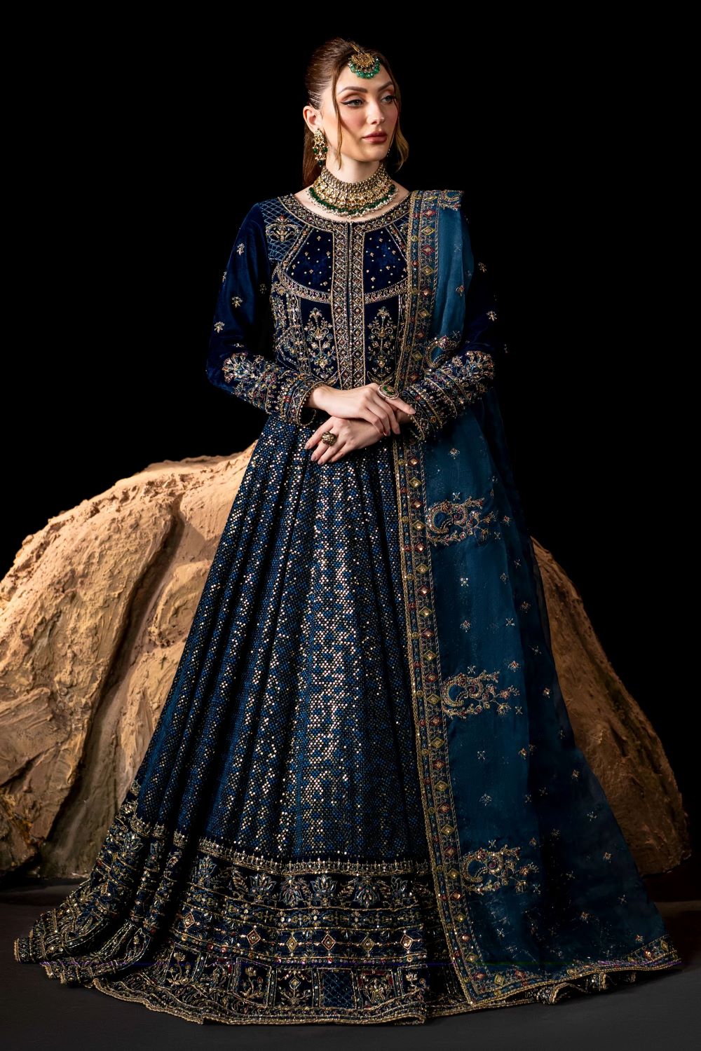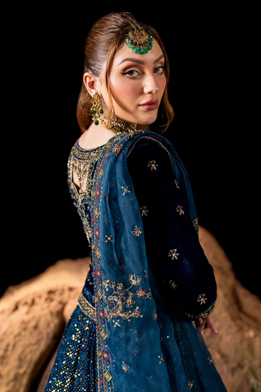 Rija is the epitome of luxury in a peacock blue hue. The well composed choli is adorned with hand adda embellishments featuring crystals, stone work, sitari, kora, dabka & cut dana along with contrasting accents of red, green & gold. The choli comprises of mid slit along with embellished and embroidered borders finished with minimal laces. The back is adorned with stylized keyhole bejeweled with heavy handmade crystal tassels along with hand adda embellishments & embroidery. It is paired with a voluminous l;ehanga adorned with heavy sequin work & thread textures radiating glistening shine, finished with heavily hand embellished and embroidered border finely finished with trims & facing. Rija s topped with heavy embroidered& sequin detailed organza dupatta with length wise statement motifs & mini motif spread in mid, finished with 4-sided embroidery border with sequin details, trims & facing to give that stiff luxury feel.