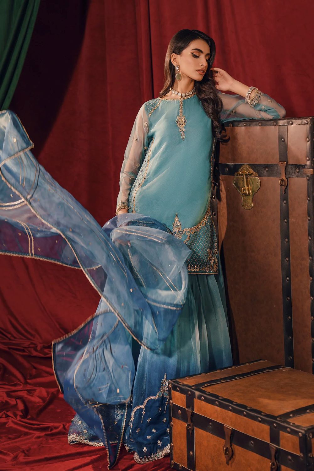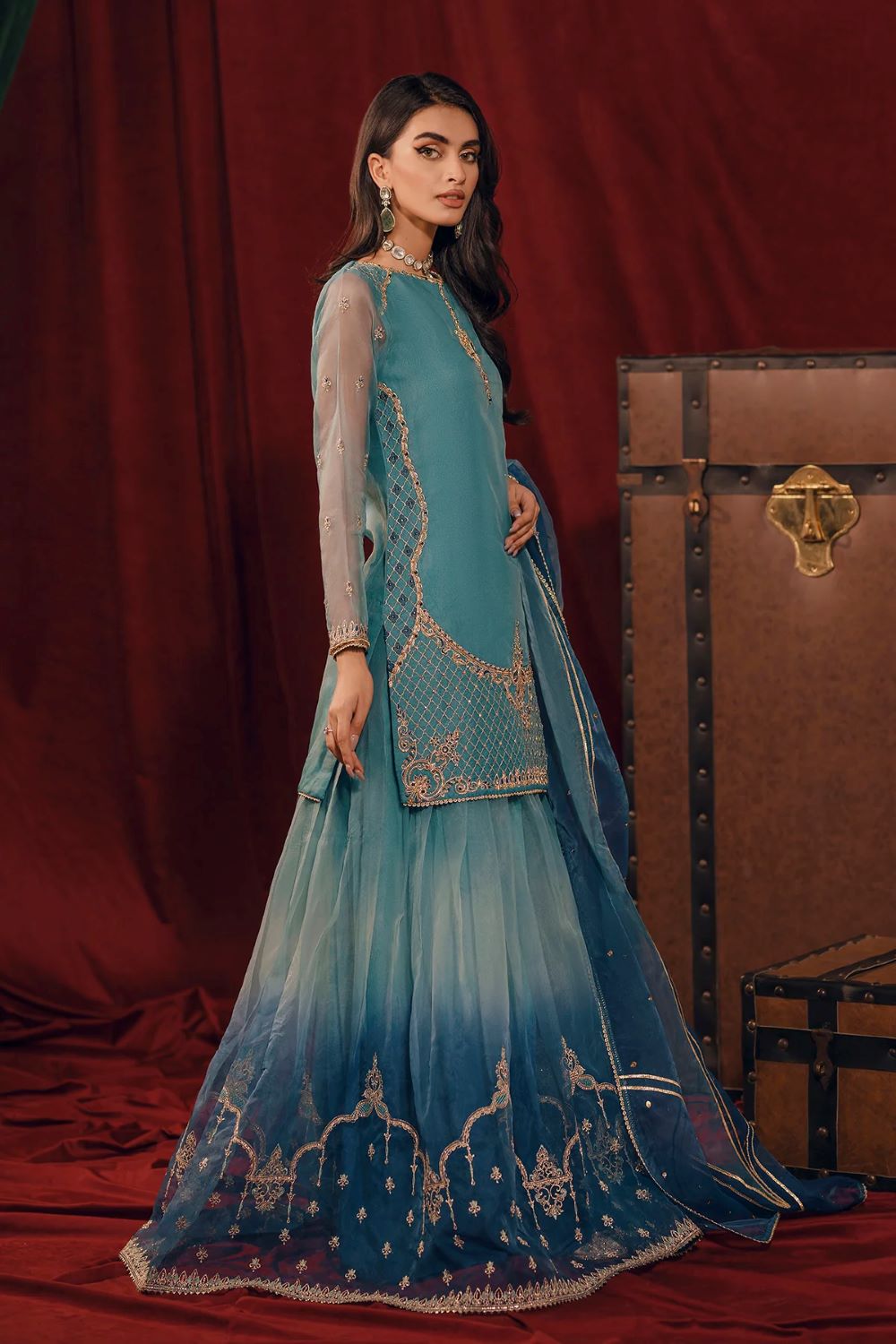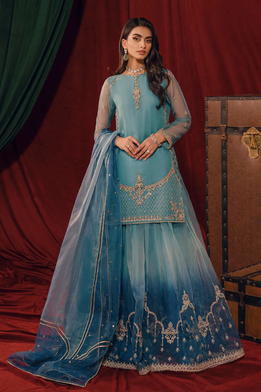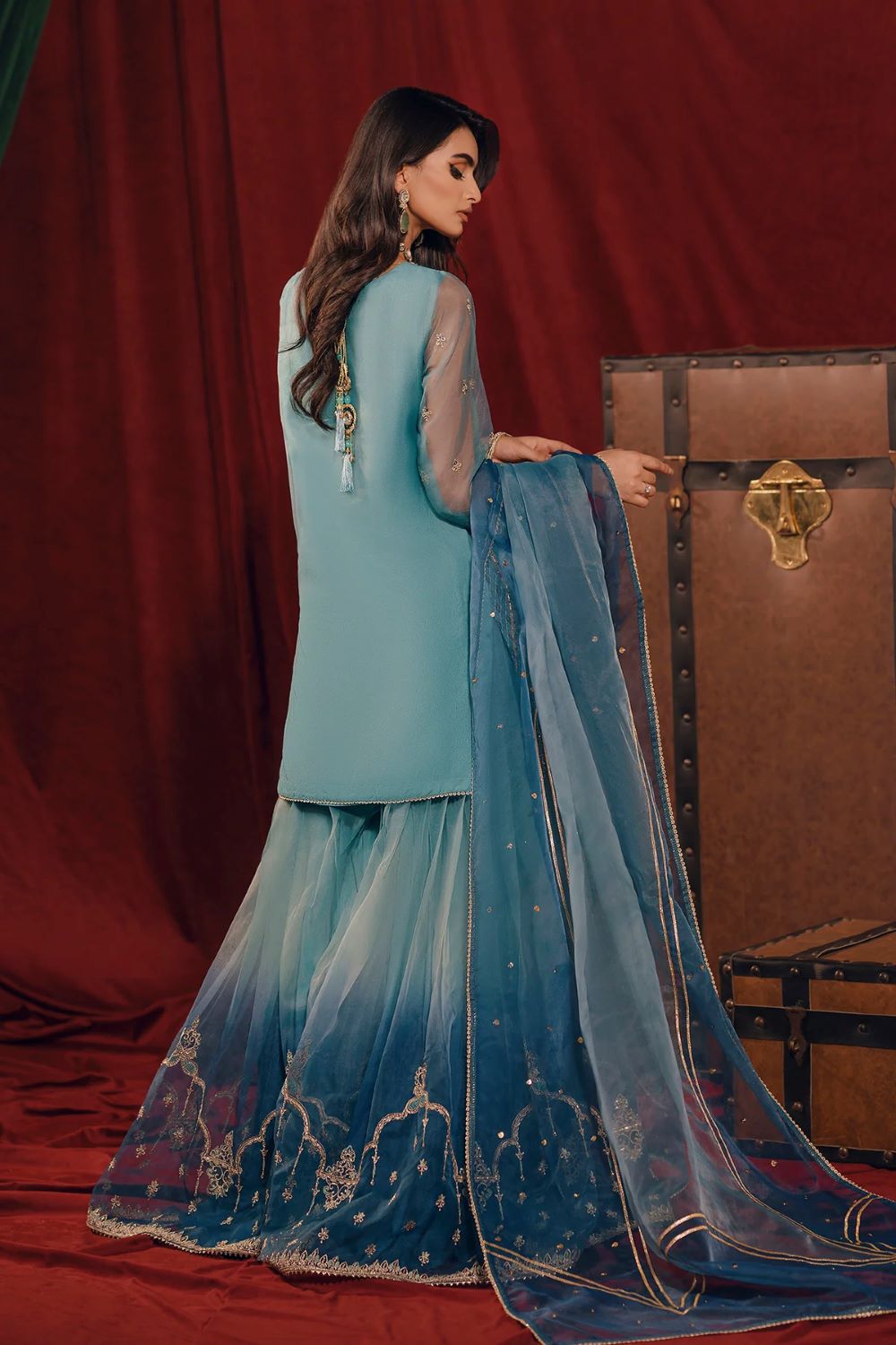 Details:Â This blue hued ensemble is adorned with machine embroidery & adda embellishments with captivating motifs. Fitted sleeves are jeweled with embellished motifs with minimal lace finishing. Outfit comes with a tie & dye sharara adorned with machine embroidered motifs laced ends. Sabz is topped with tie & dye dupatta with goti & sitari work with minimally laced borders.