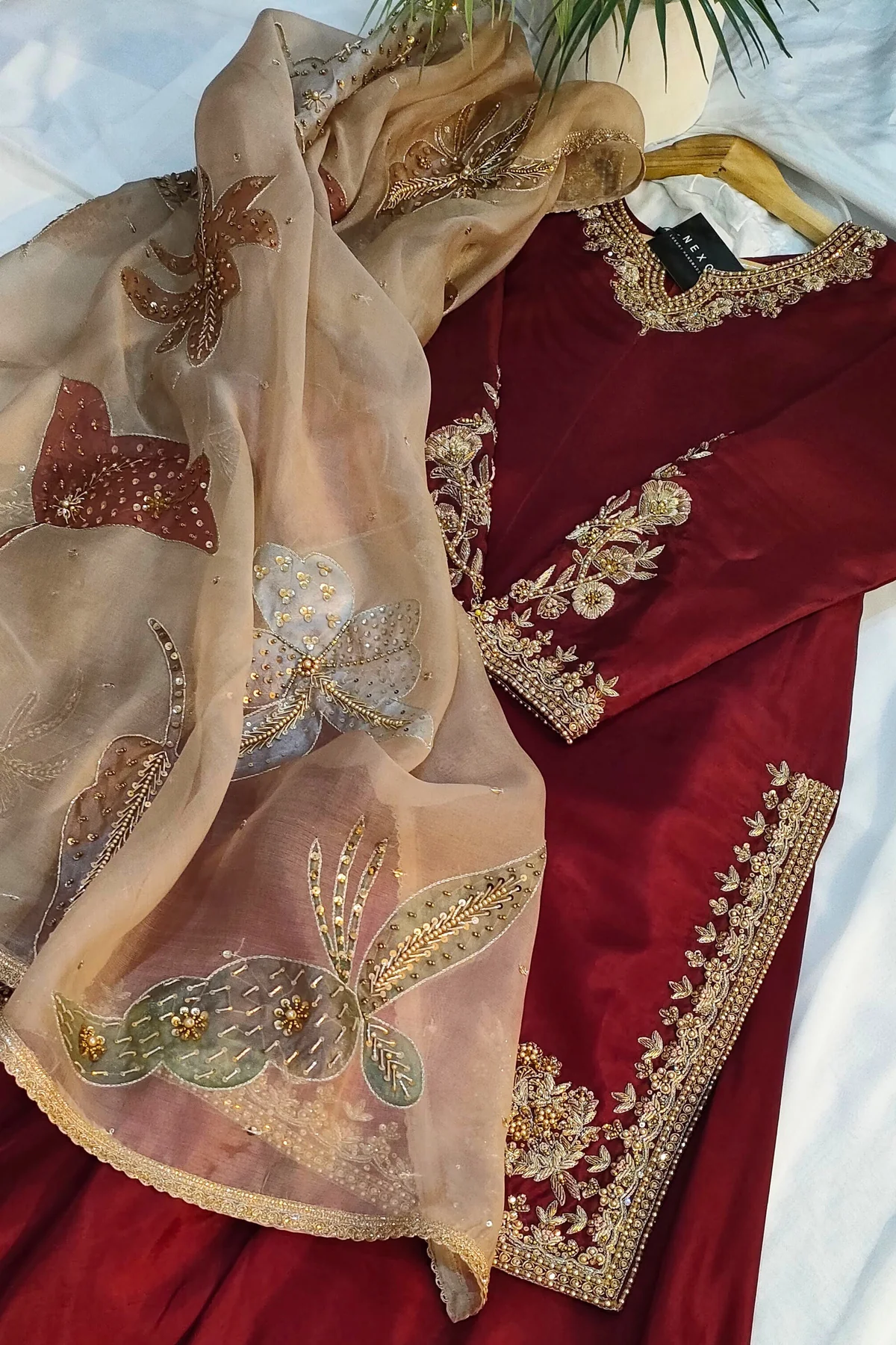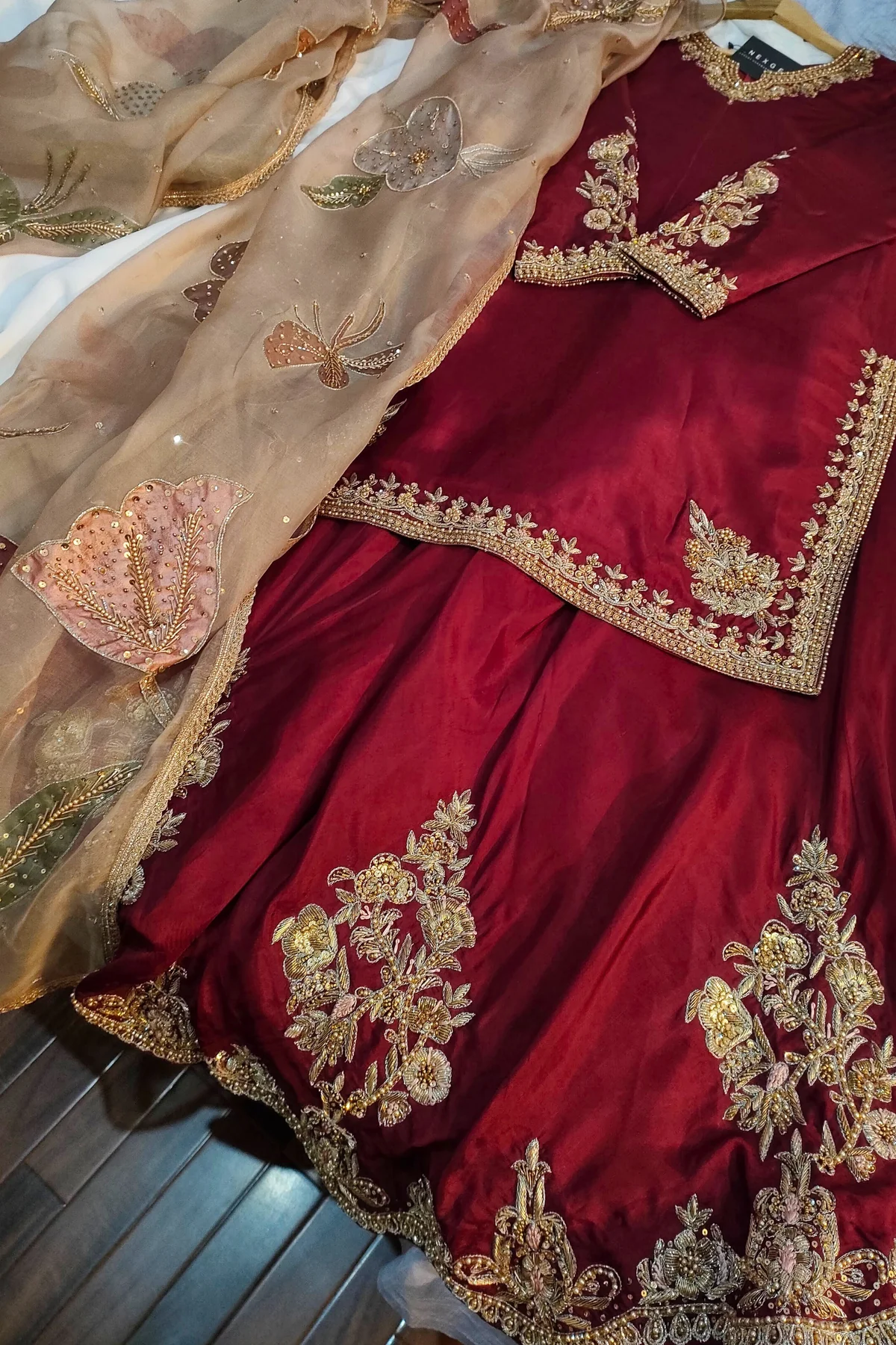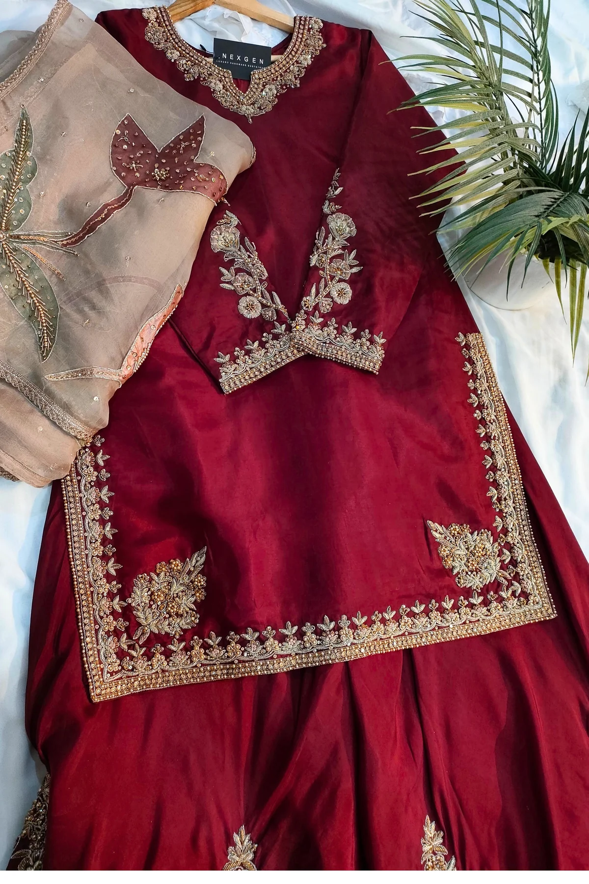 Maroon Rouge is an enchanting deep maroon sharara set that exudes timeless elegance. The shirt and sharara are adorned with intricate dabka handwork, showcasing exquisite craftsmanship and detail. Paired with a soft pinkish hand-painted and hand-embellished dupatta, Maroon Rouge combines rich tones with delicate artistry. This ensemble is perfect for those who appreciate a harmonious blend of traditional charm and refined elegance.