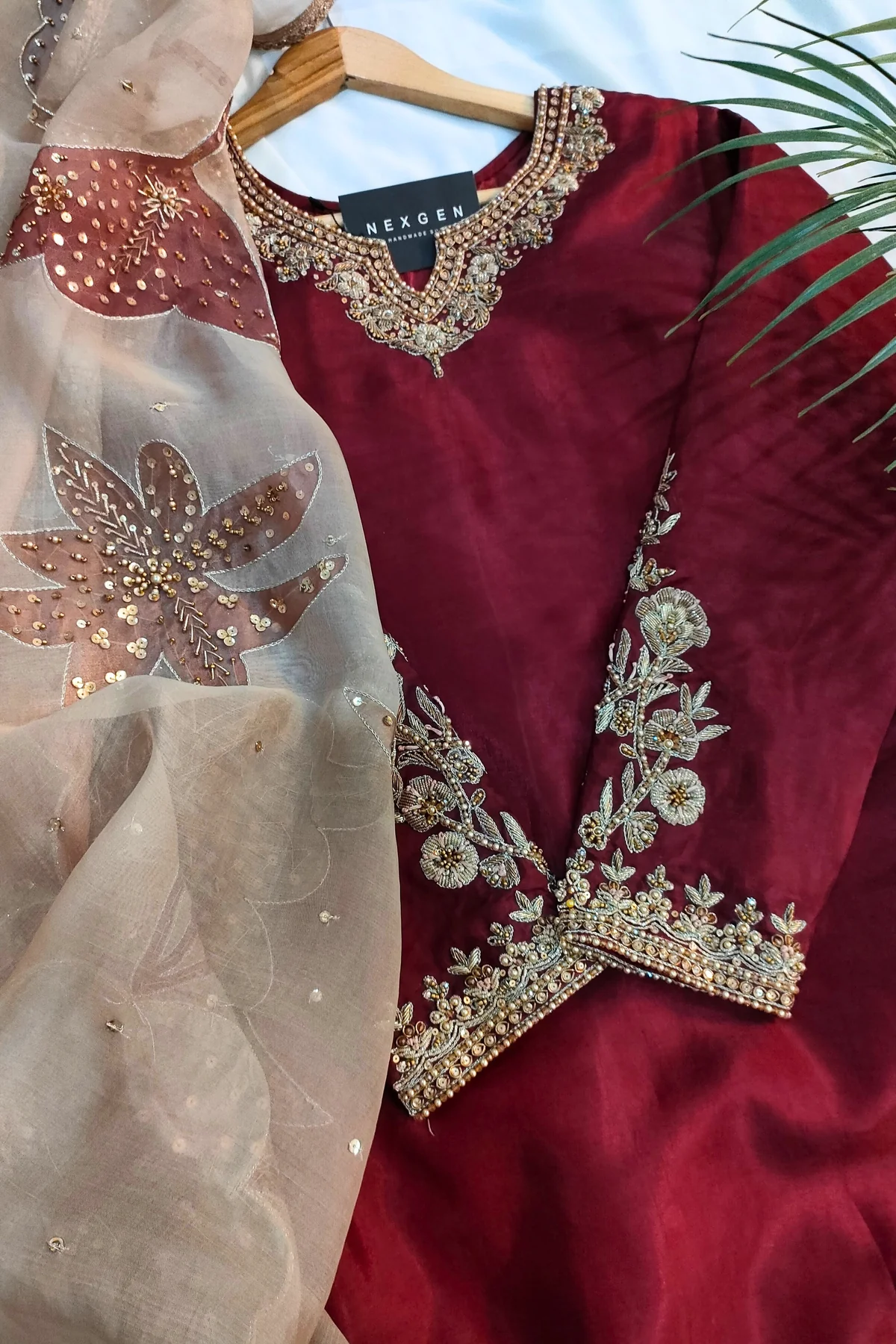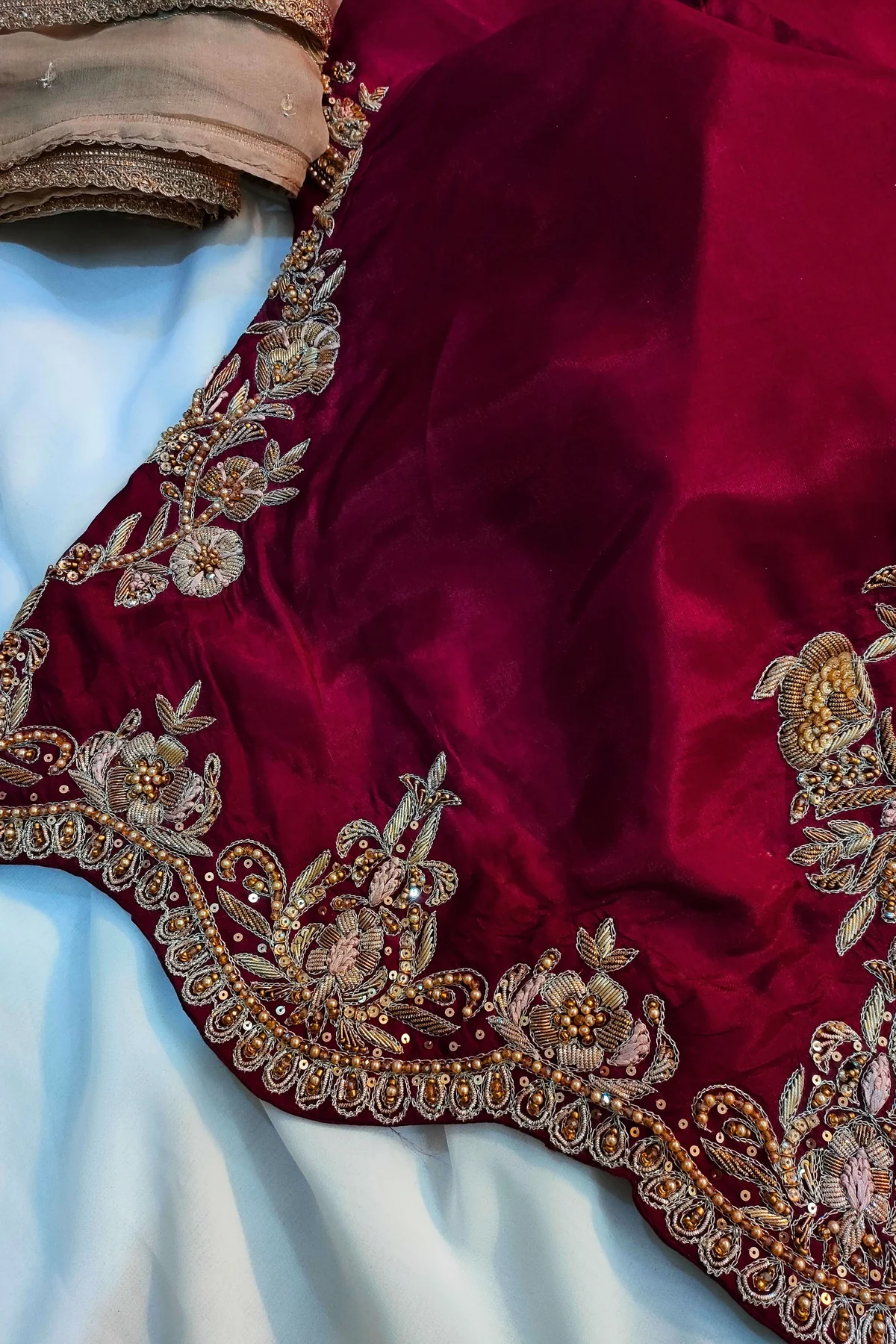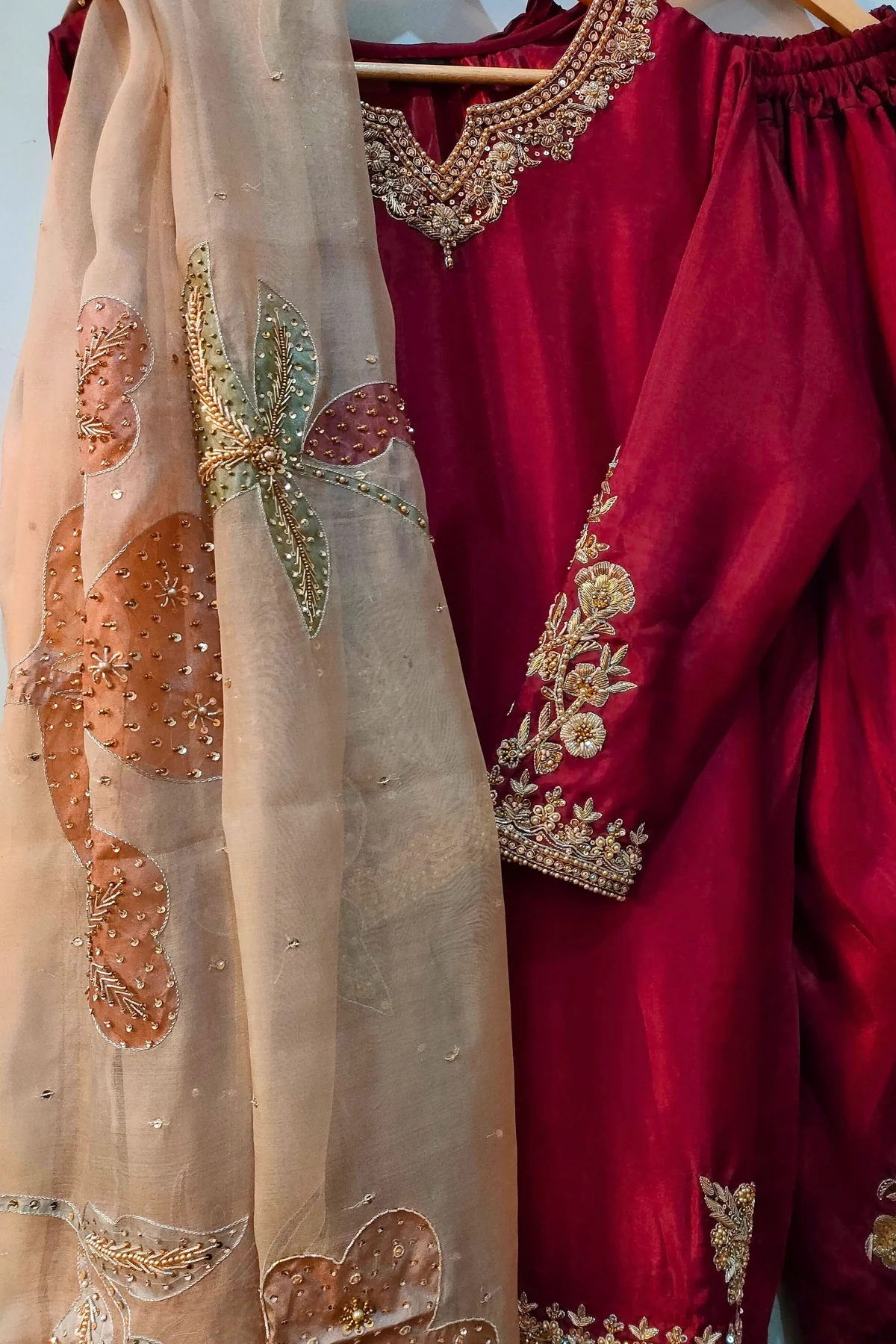 Maroon Rouge is an enchanting deep maroon sharara set that exudes timeless elegance. The shirt and sharara are adorned with intricate dabka handwork, showcasing exquisite craftsmanship and detail. Paired with a soft pinkish hand-painted and hand-embellished dupatta, Maroon Rouge combines rich tones with delicate artistry. This ensemble is perfect for those who appreciate a harmonious blend of traditional charm and refined elegance.