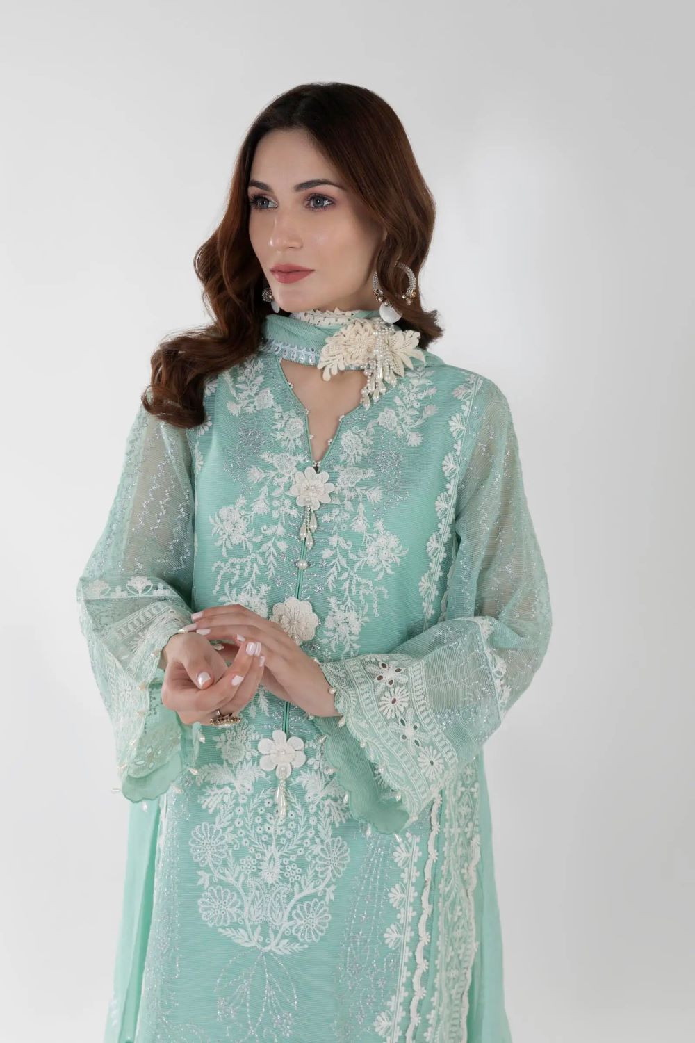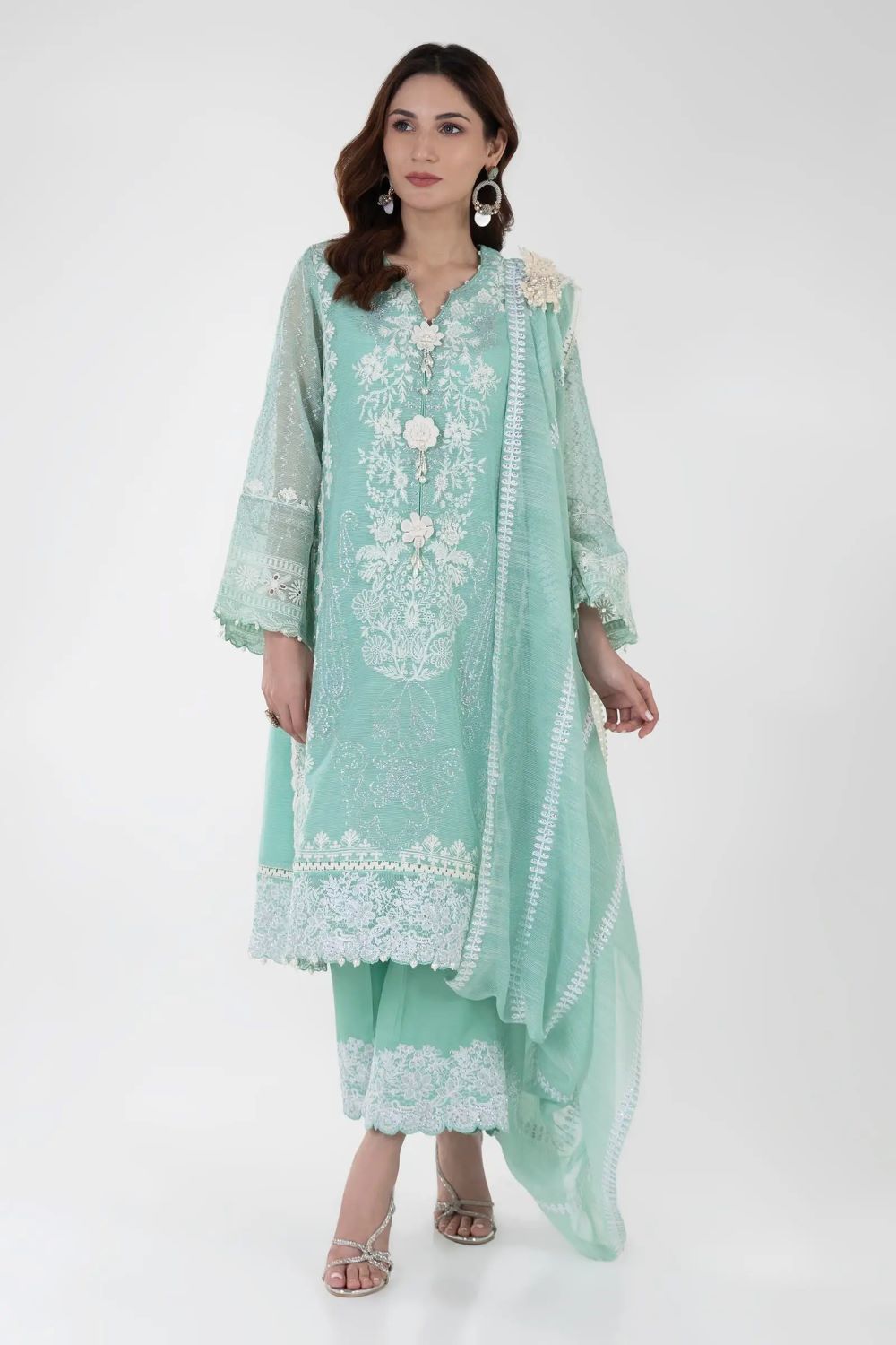 An elegant appearance is achieved through a teal ensemble adorned with both embroidery and lace embellishments.