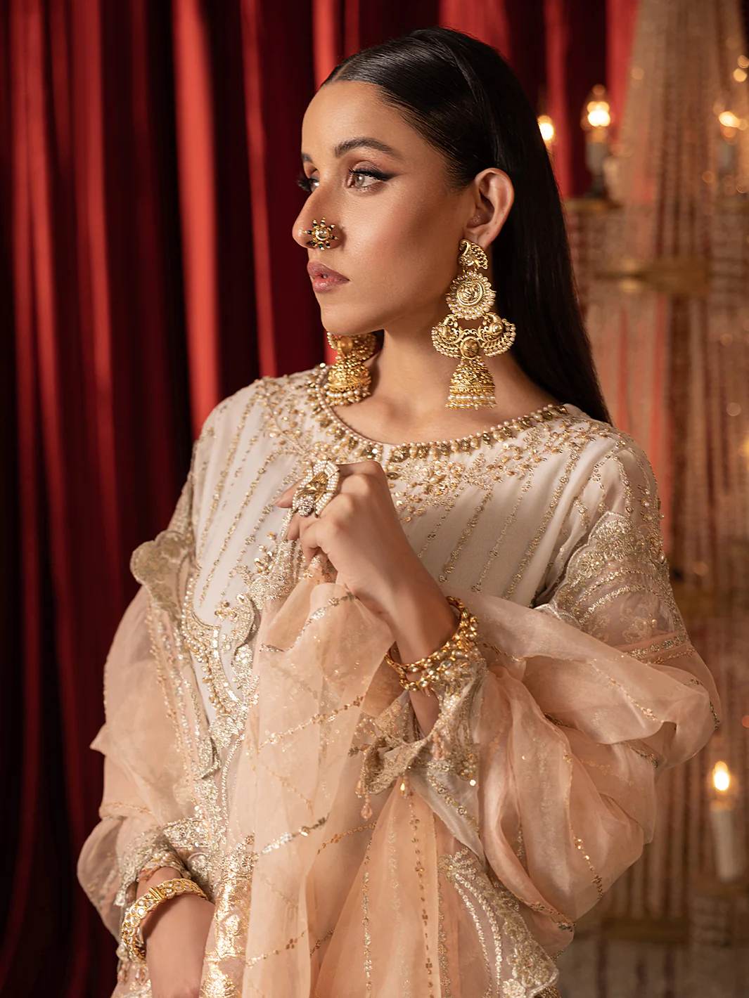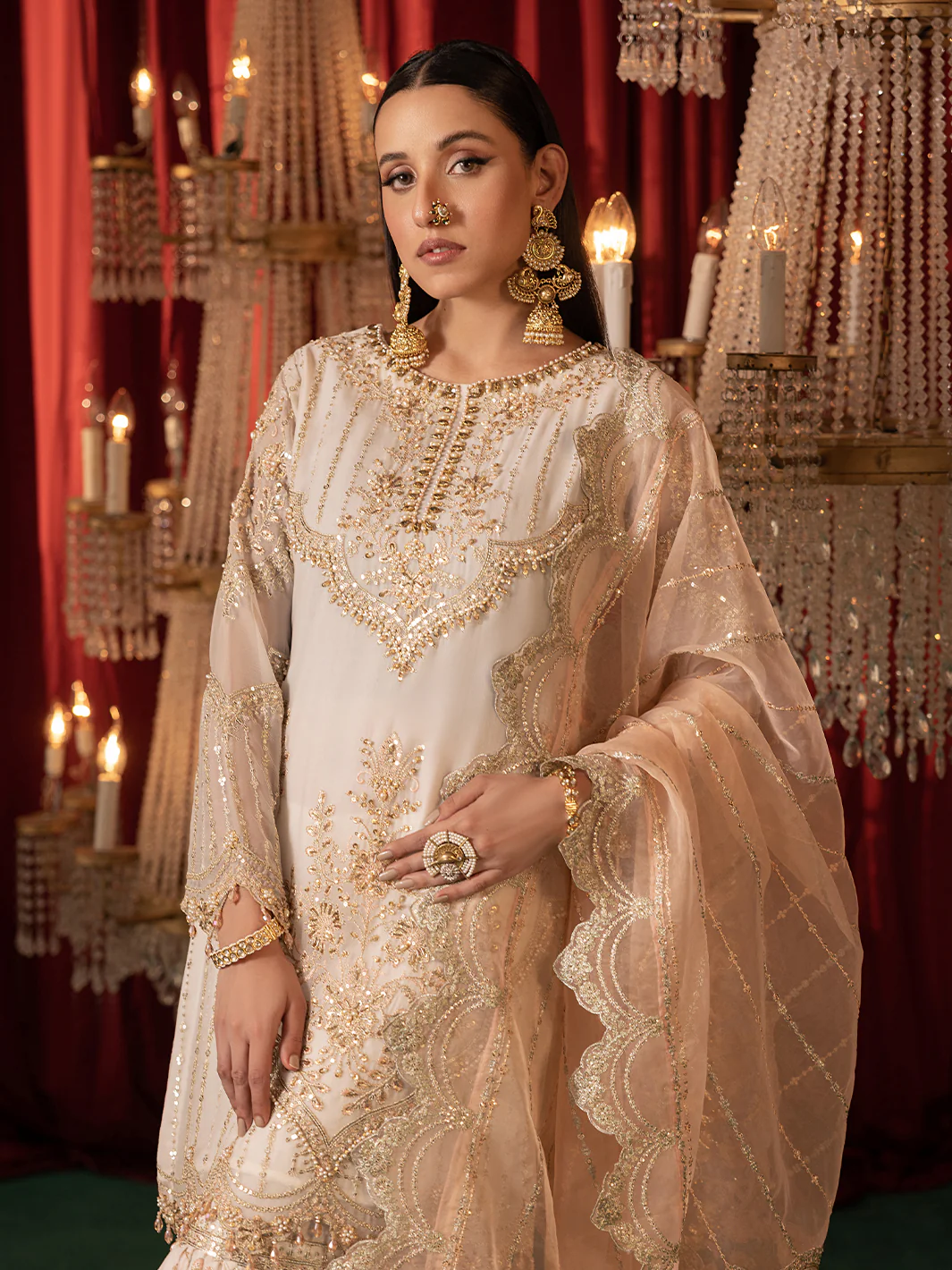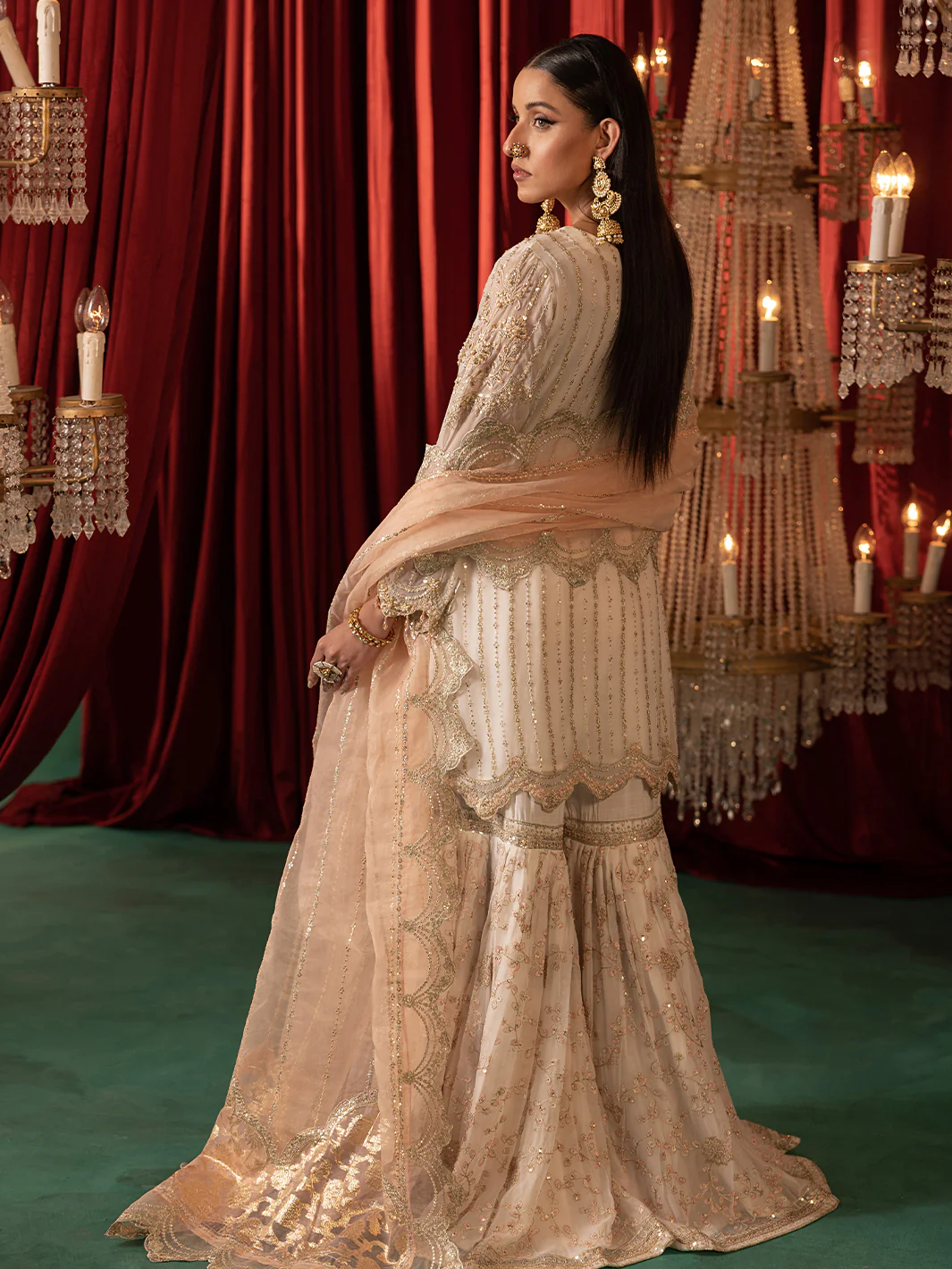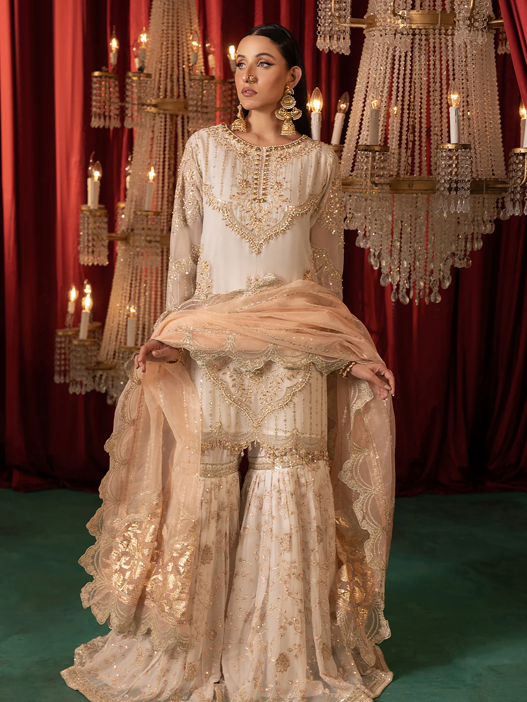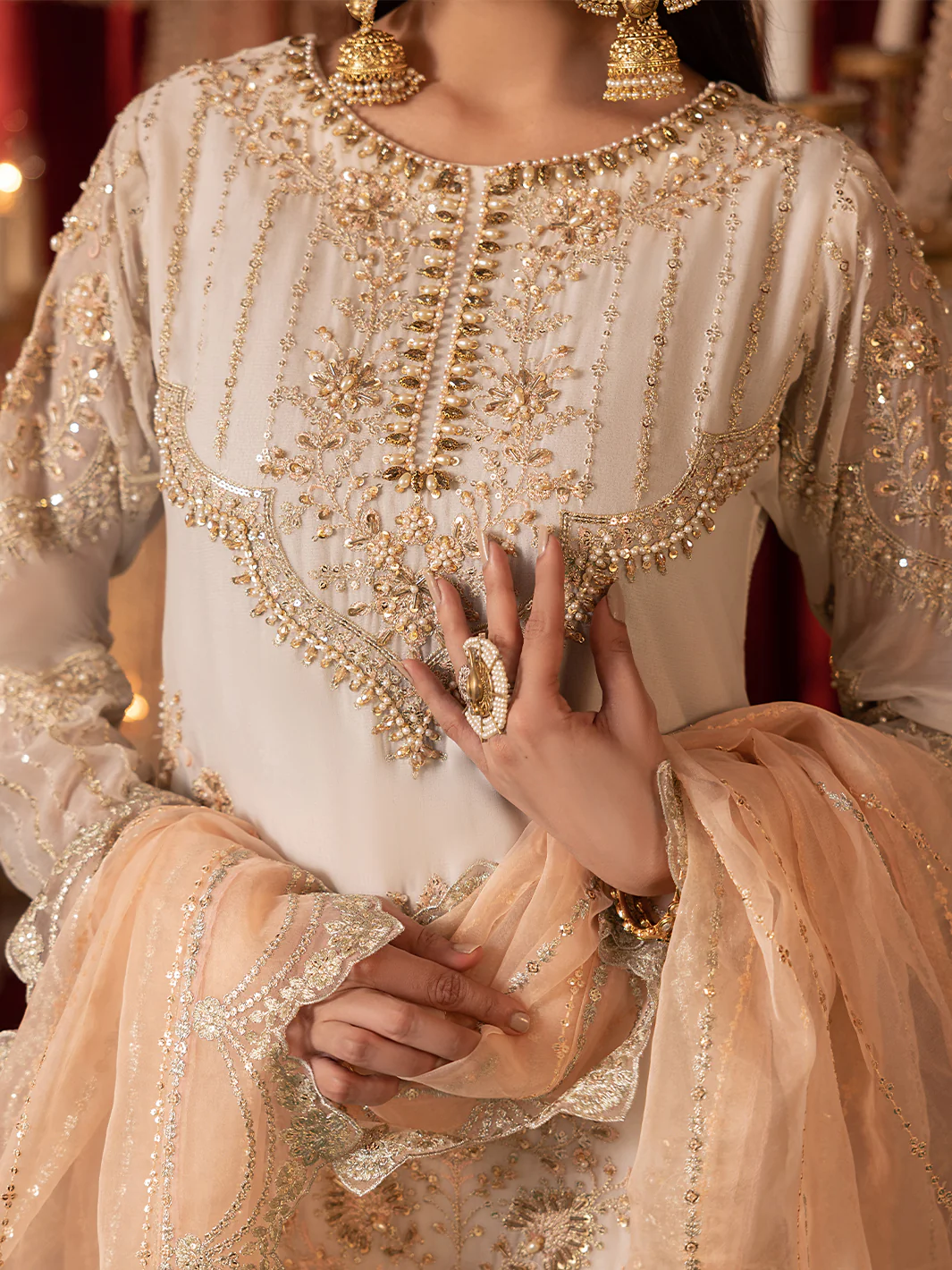 “This collection is a tribute to the subcontinent’s rich heritage, showcasing kamdani, embellishments. Woven with fine tilla work and Gold sequence