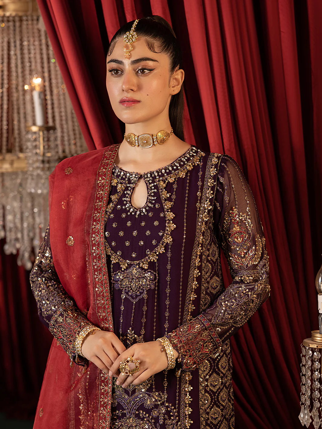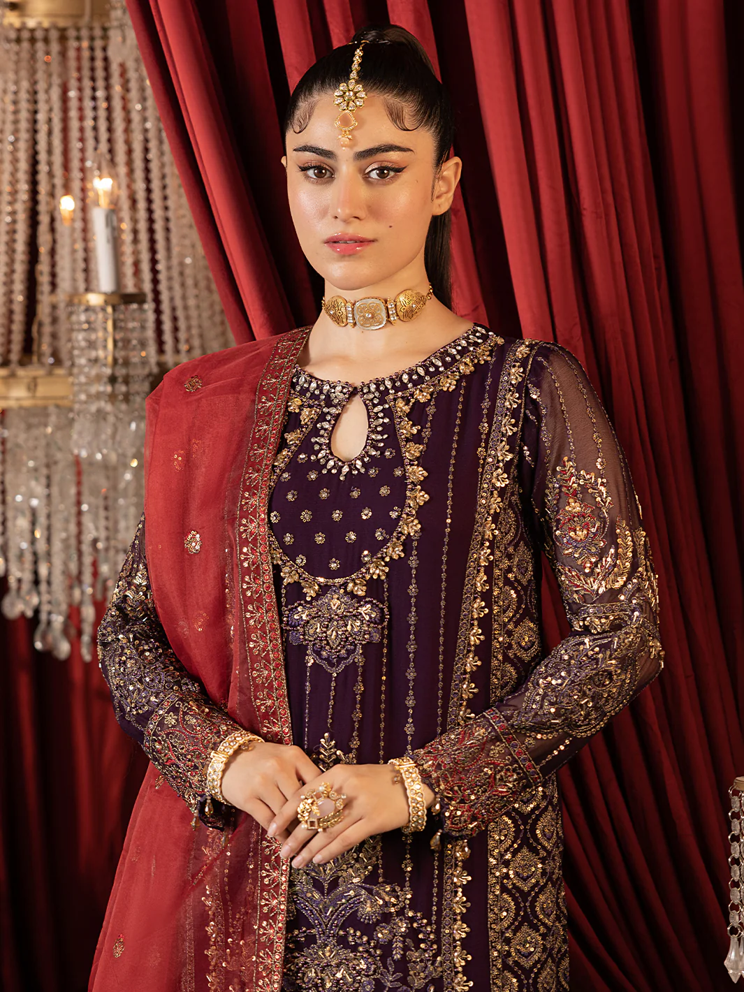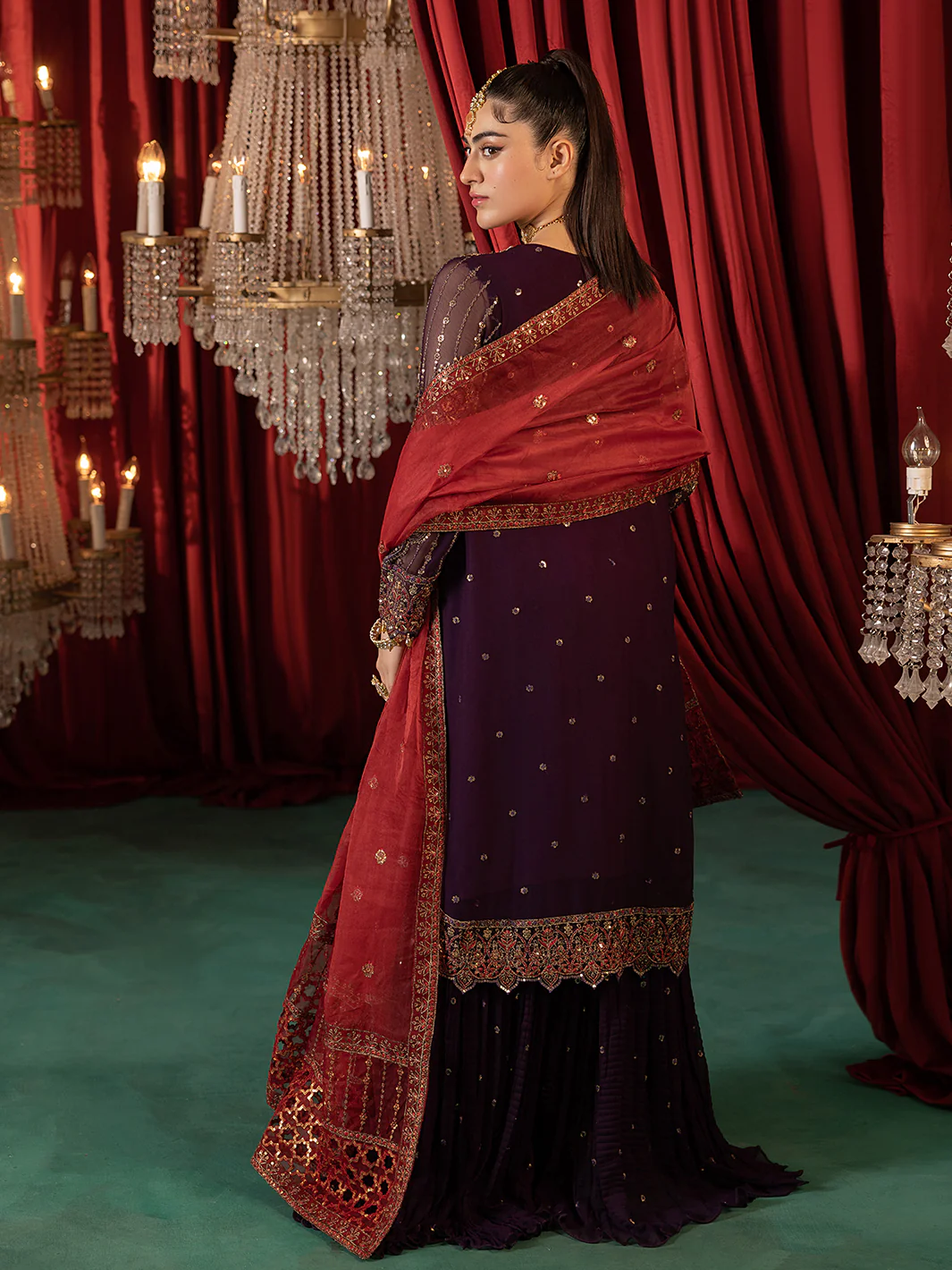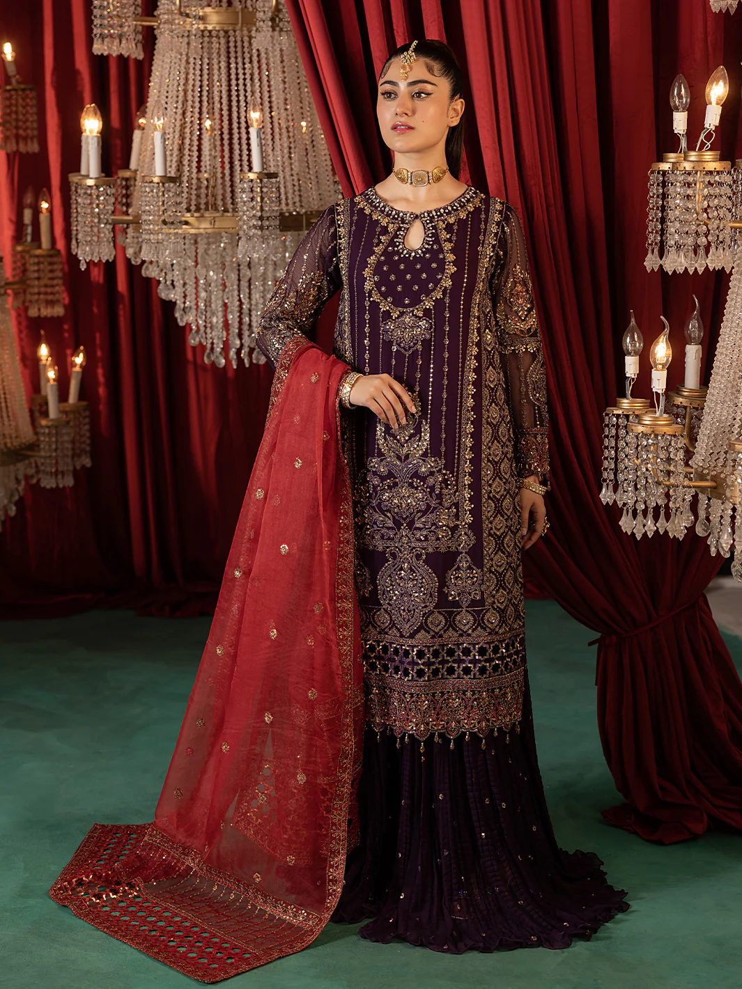 Exude elegance and sophistication in this breathtaking berry-hued masterpiece! This exquisite three piece crush Sharara ensemble features a sumptuous premium chiffon embroidered shirt.