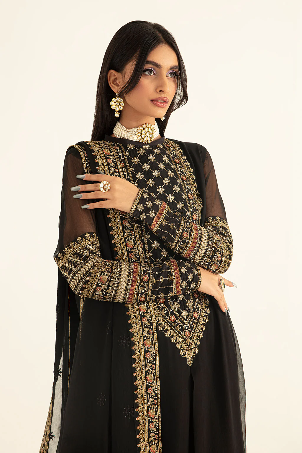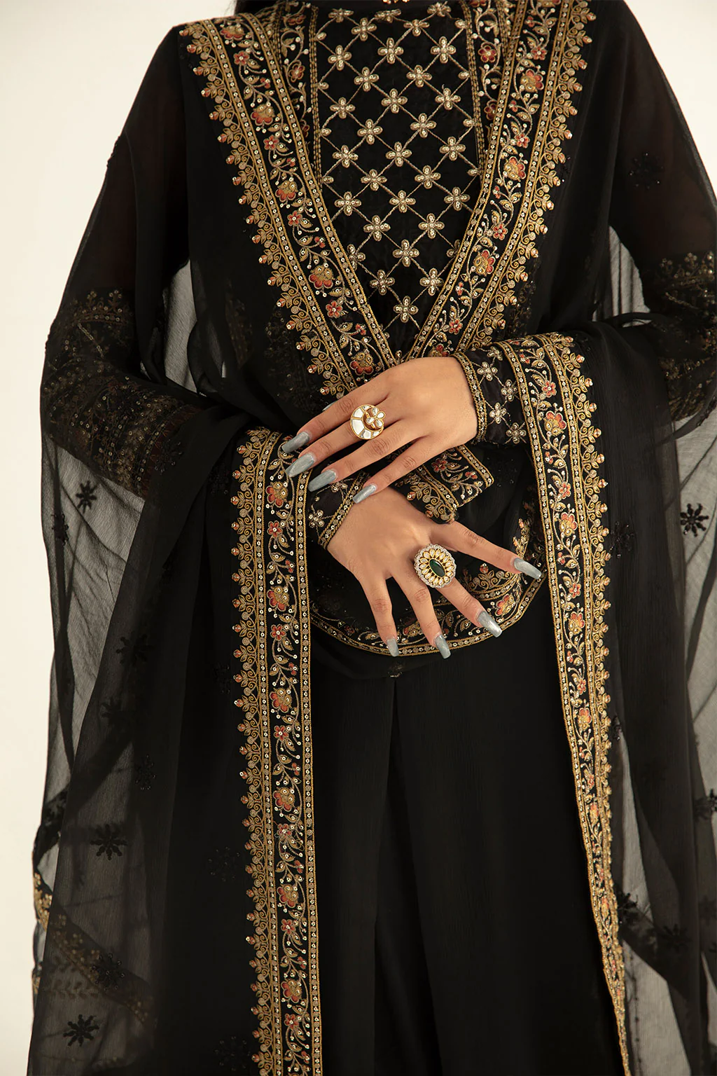 Shirt : An absolute elegant chiffon black shirt with a heavily embroidered front and embellished border adding to the detail and exquisitely of this fit.
