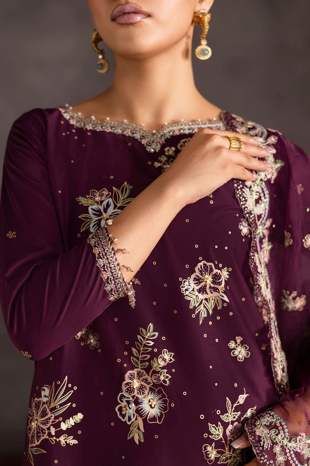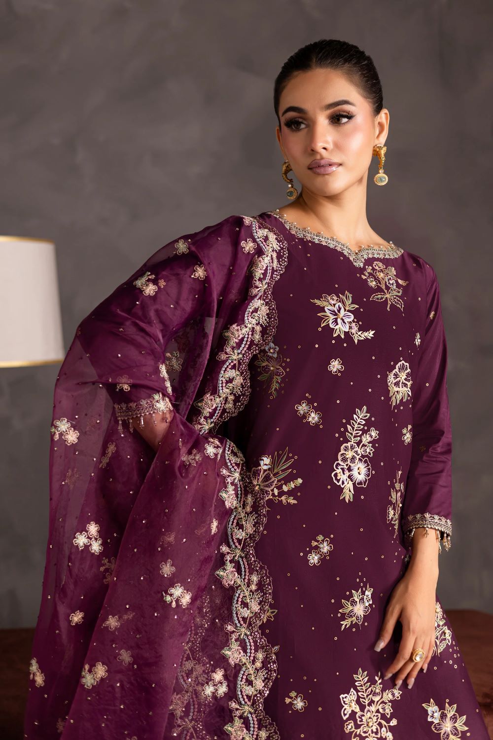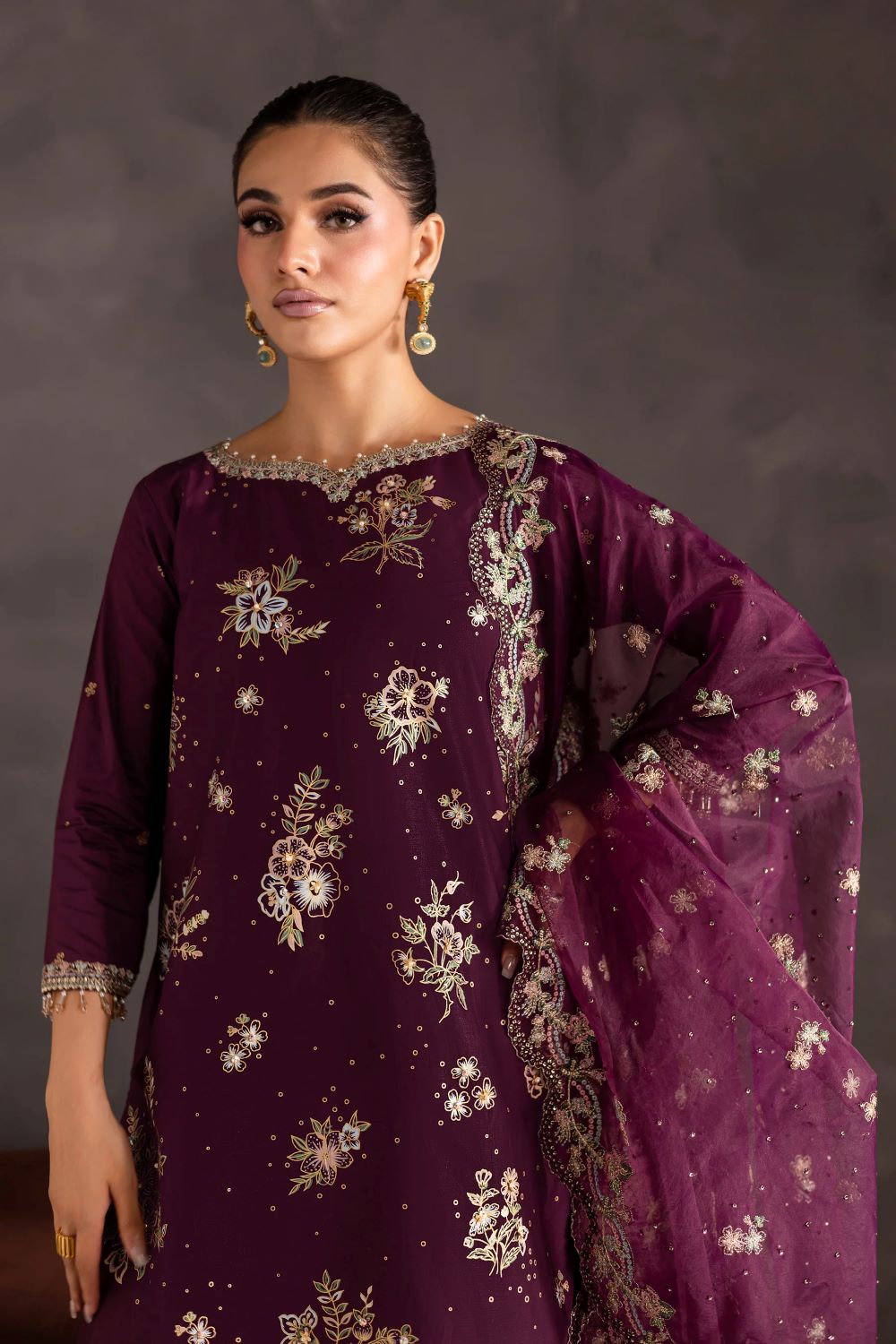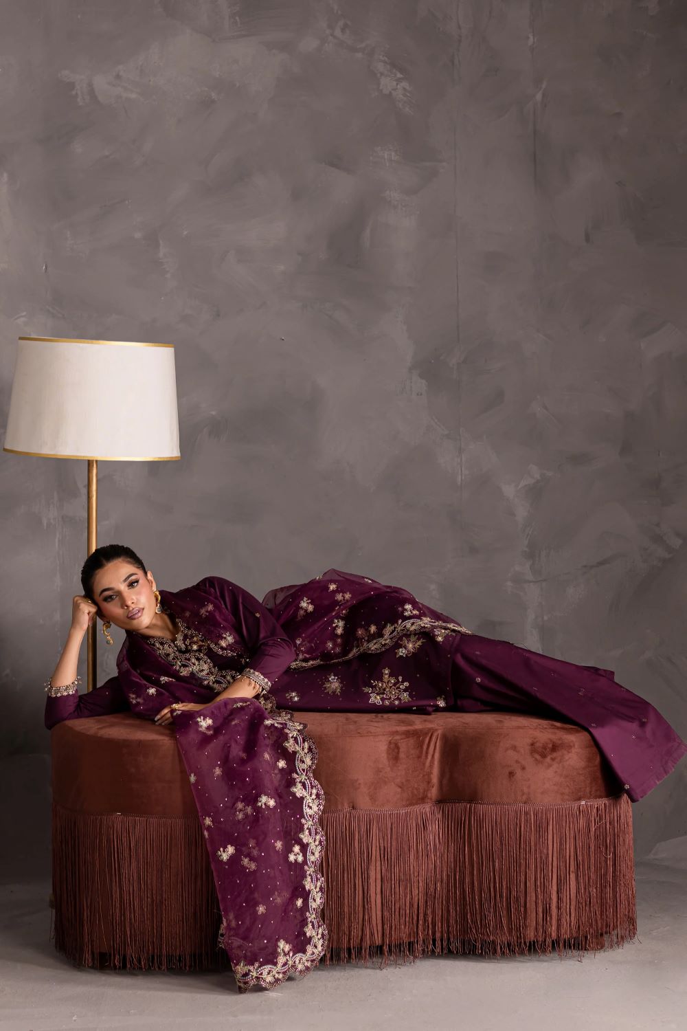 In a rich purple hue, this Egyptian cotton ensemble features a short shirt with screen-printed detailing and intricate adda work on the neckline. The neckline is further enhanced with contrast beads, adding a pop of color and texture. Three-quarter sleeves are decorated with screen printing and finished with an embroidered border, giving the shirt a festive and youthful vibe.