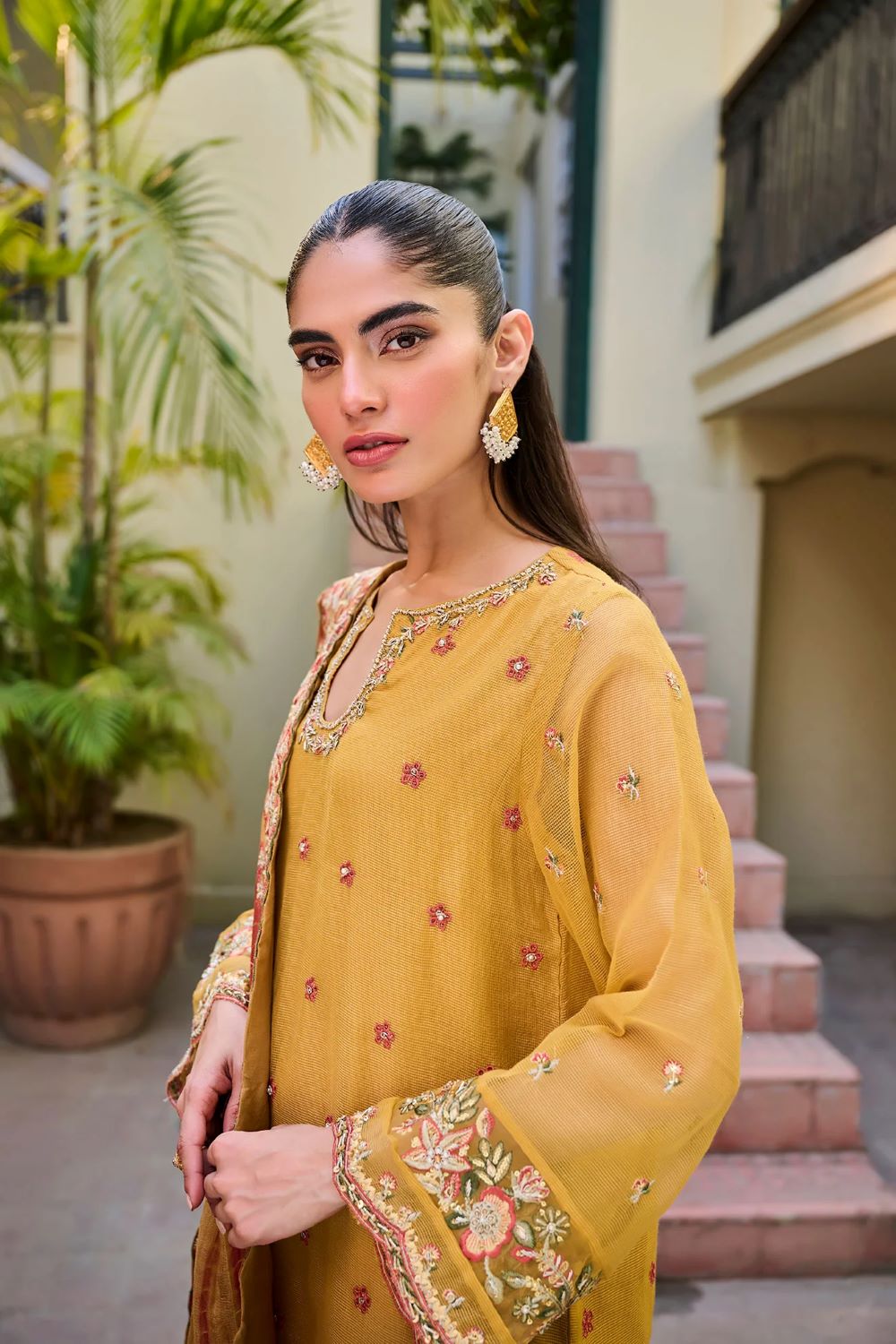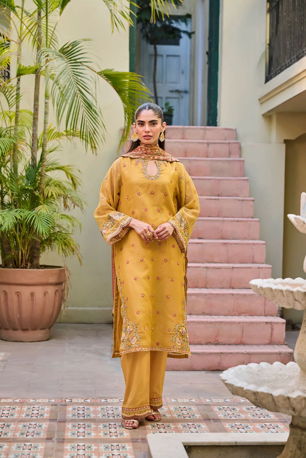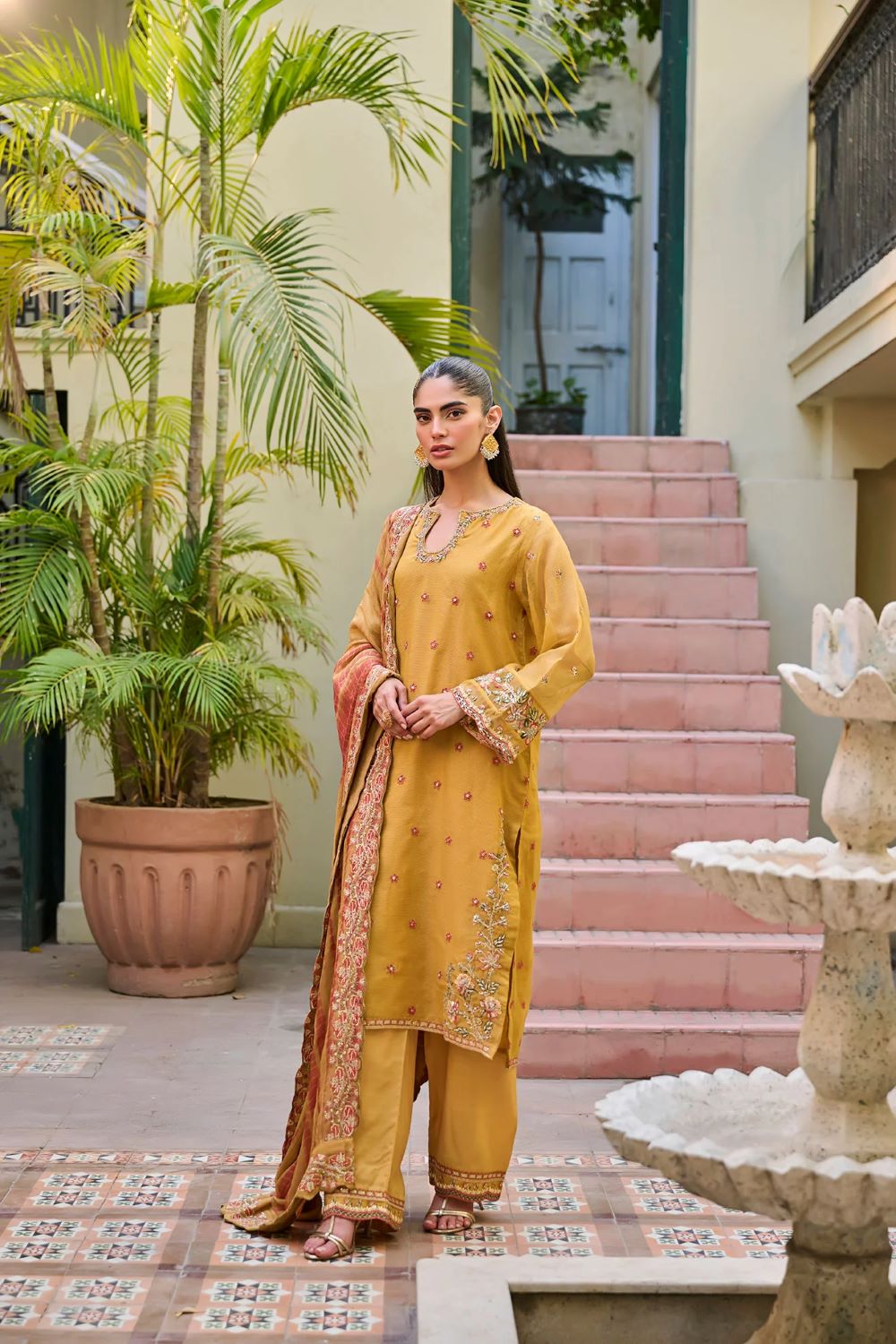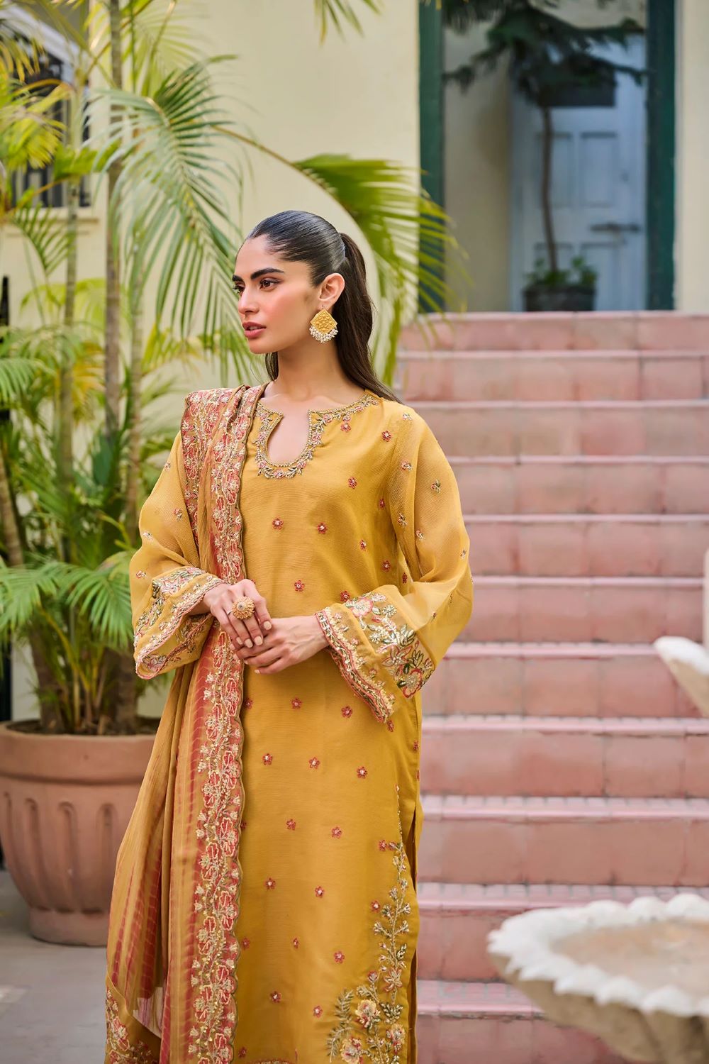 Presenting a stunning display of colors through this masterpiece from Dhanak’s Luxury Eid Collection. The kurta in the design showcases a stunning display of intricate embroidery, featuring elaborate patterns that exude elegance and sophistication. The coordinating pants are also embellished with fine embroidery, creating a harmonious and stylish look. The ensemble is completed with a beautifully embroidered dupatta, adding a touch of refinement and grace to the outfit.