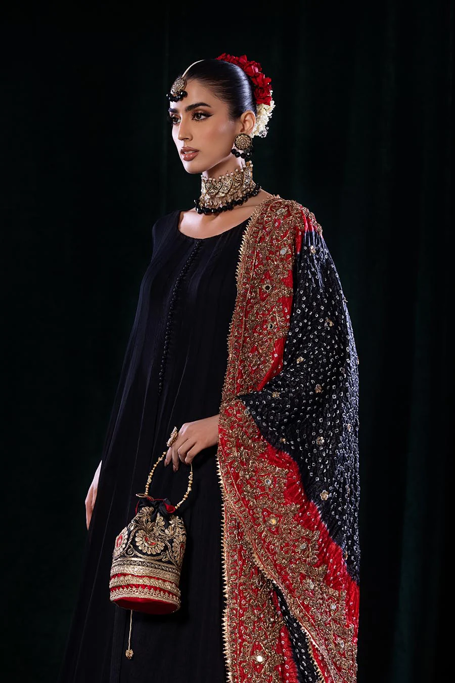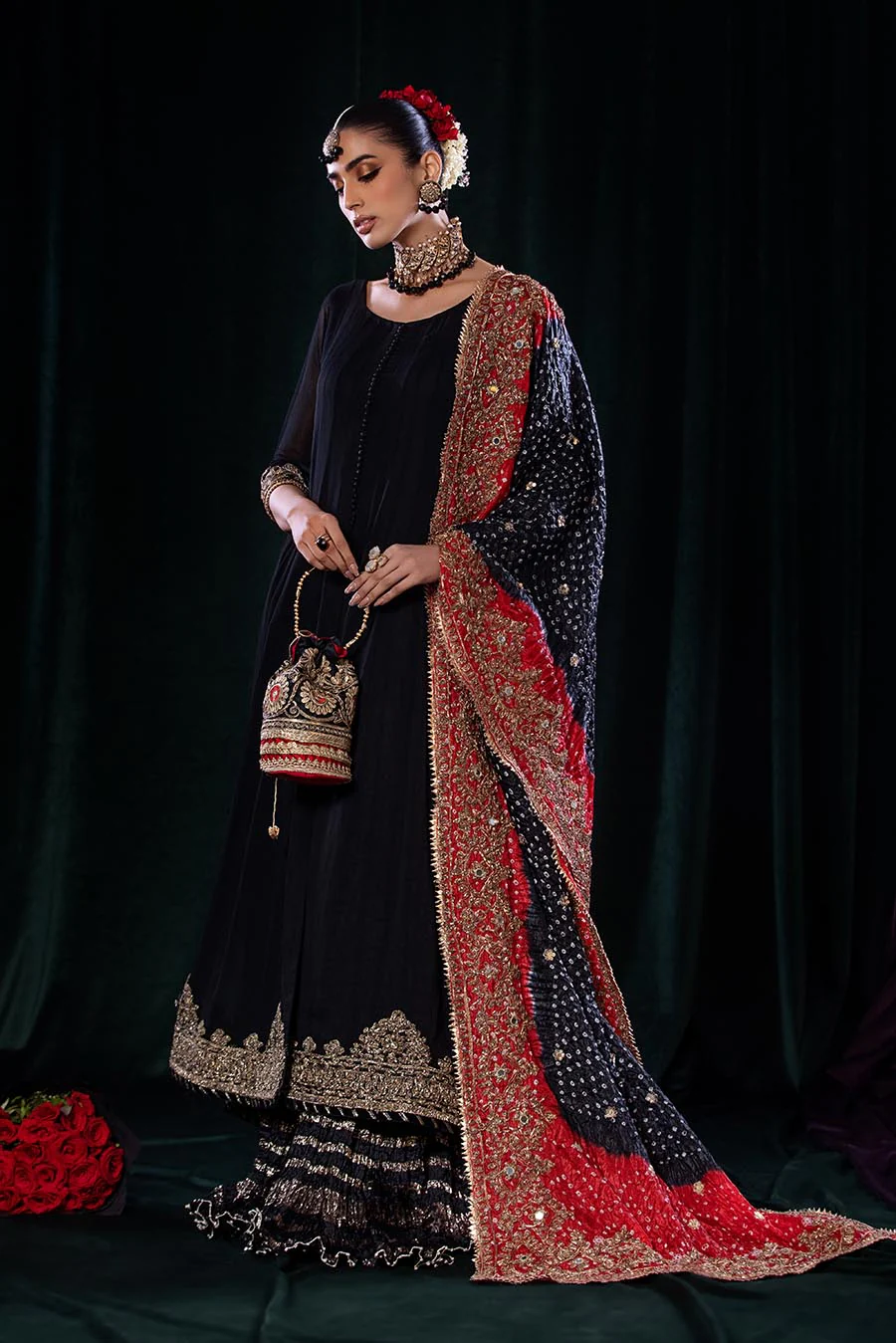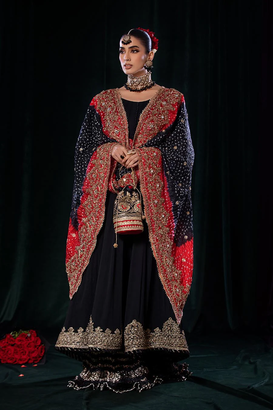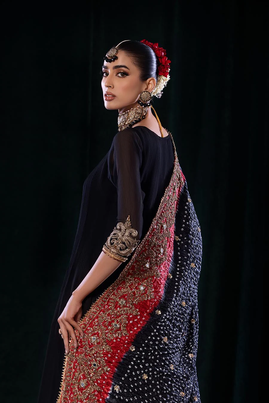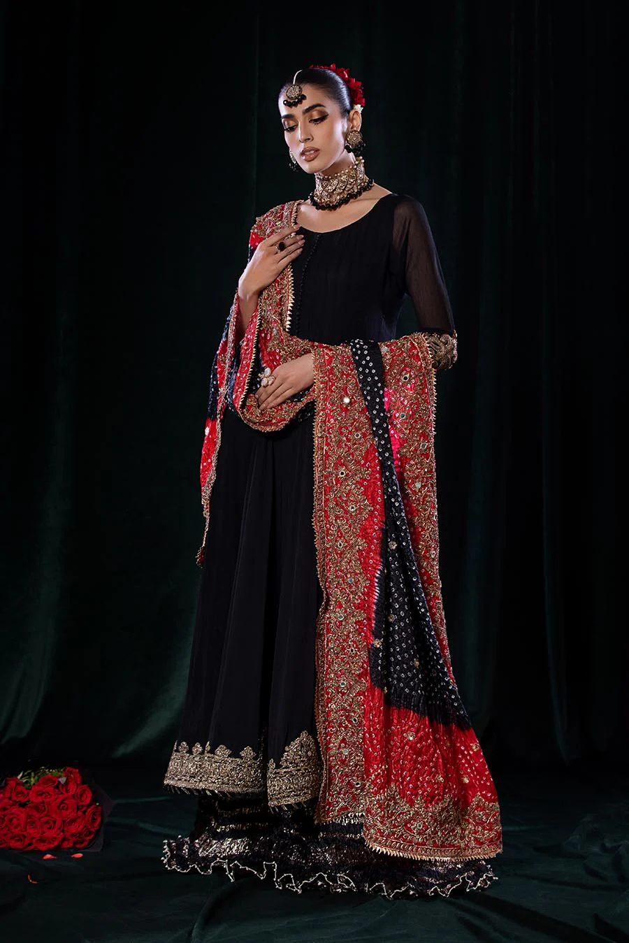A symphony of grace unfolds in this ensemble. The Pure Crinkle Chiffon shirt, adorned with delicate Kora, Dabka, and Gotta embroidery, exudes timeless allure. Its Silk Chunnari, graced by Gotta and Sequins work, trails like a silken breeze. And behold the flowing Crushed Silk Sharara.