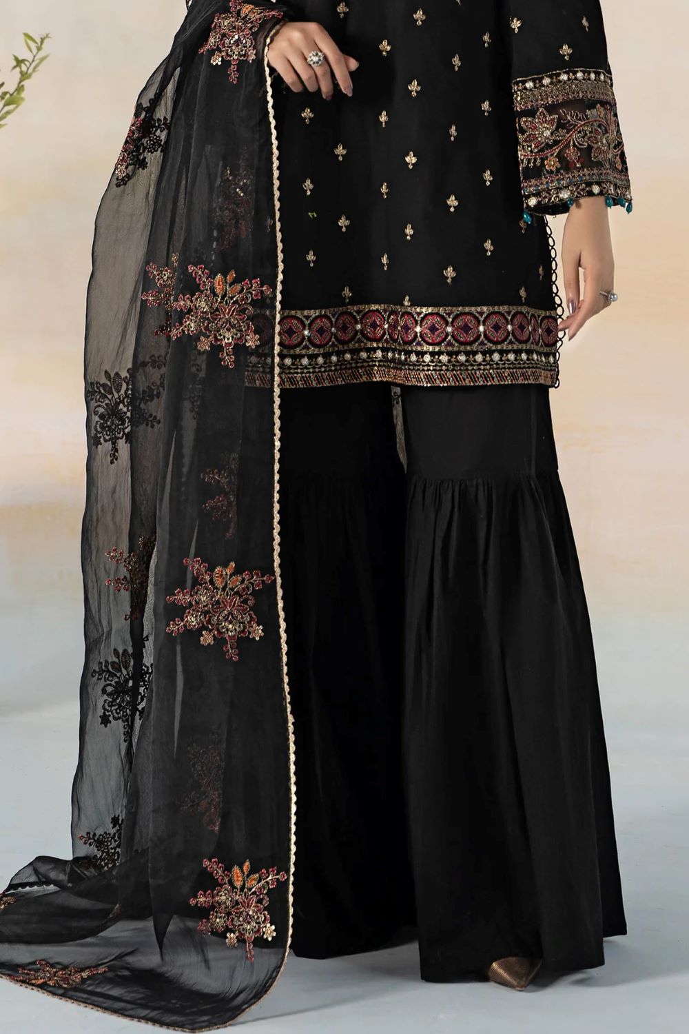 Captivate with our bewitching three-piece embroidered jacquard broshia suit that weaves an intricate symphony of floras with enchanting jacquard patterns and meticulous embroideries clad with sequins & tilla work. Enveloped with delicate ornaments & tilla balls detailing and accompanied by dyed gharara and a dupatta boasting sequins and tilla embroidered floral motifs, this ensemble seamlessly harmonizes modern trends with timeless traditions for ever-lasting elegance.