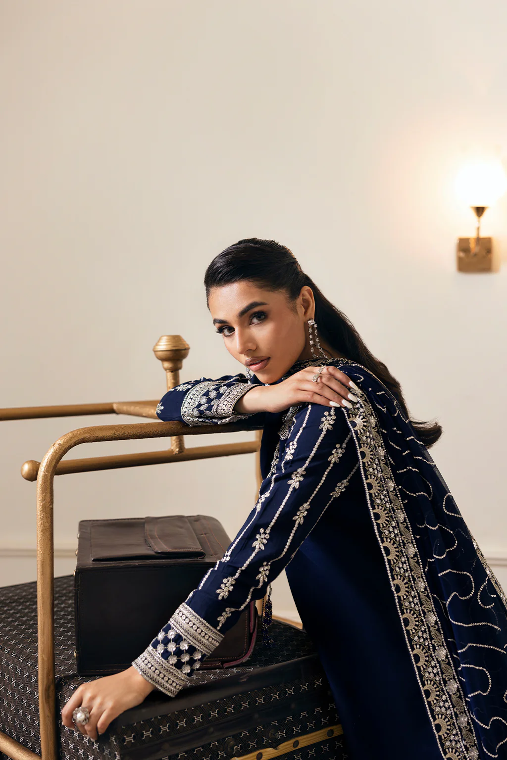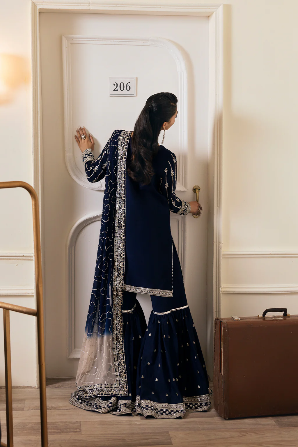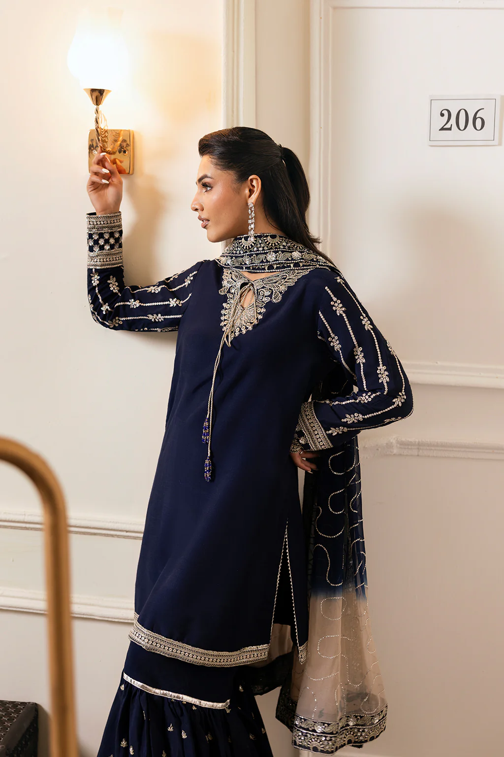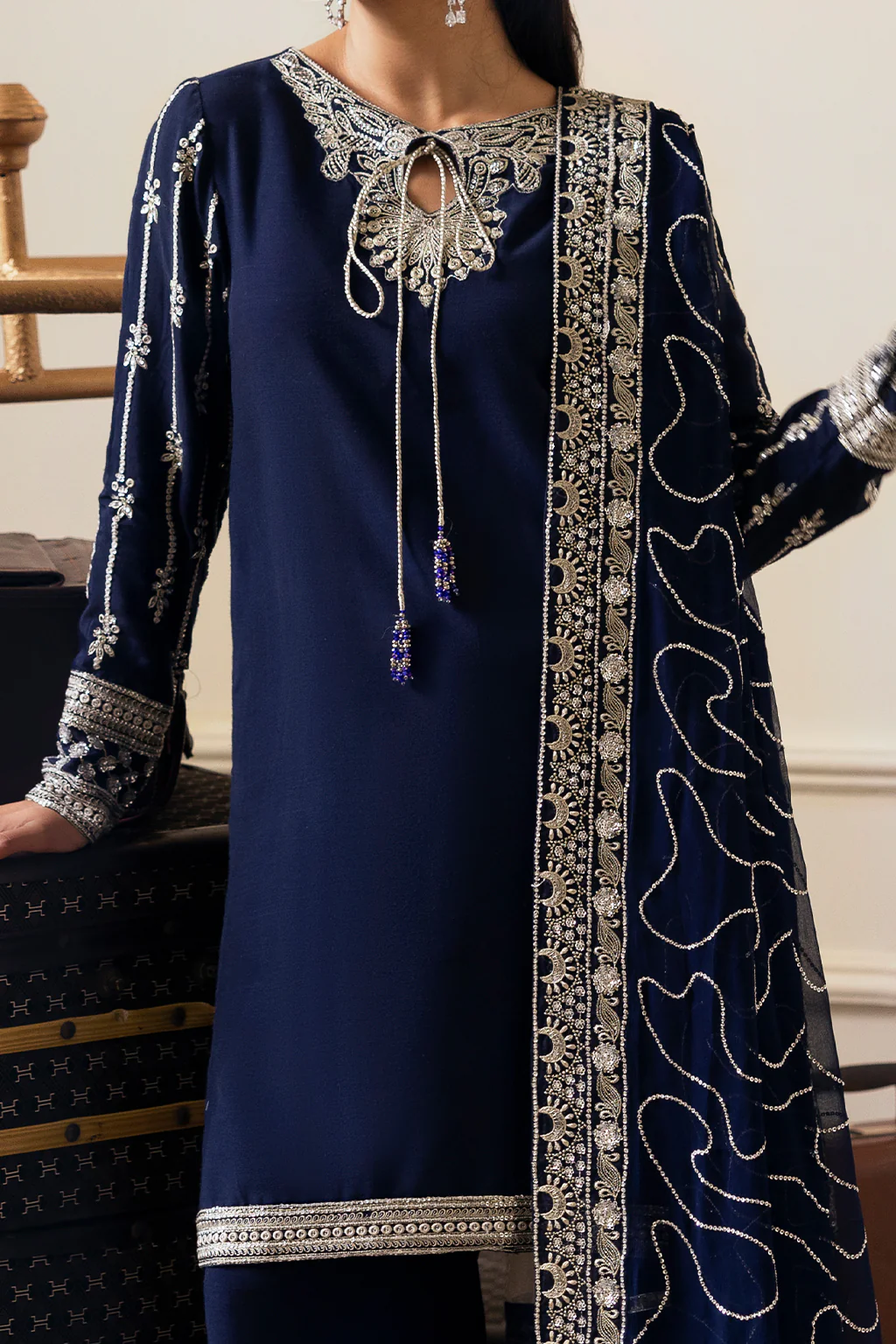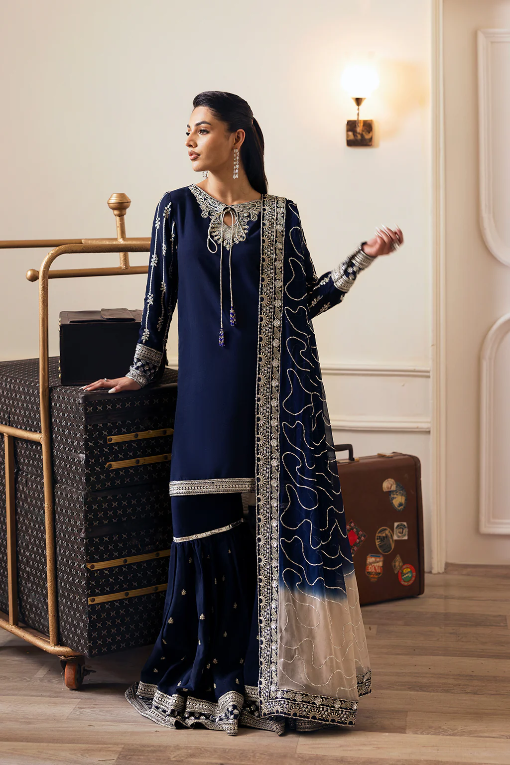 Shirt & Gharara: A navy blue shirt with tassels detail on neckline, paired with flowy gharara and embroidered tie-dye chiffon dupatta